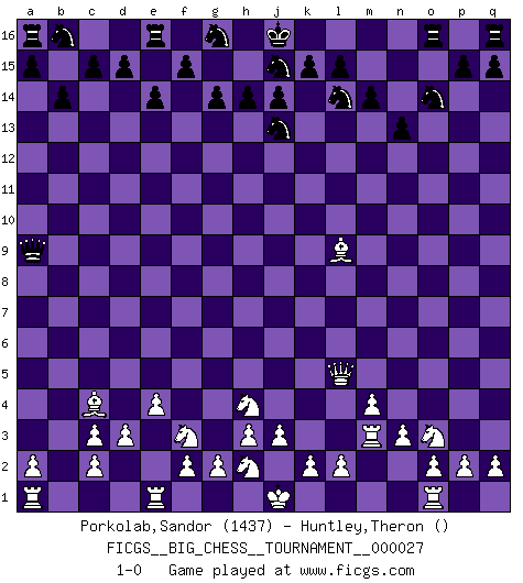 Last move : 1-0 2008 December 25 15:48:56 [Event "FICGS__BIG_CHESS__TOURNAMENT__000027"] [Site "FICGS"] [Date "2008.09.06"] [Round "1"] [White "Porkolab,Sandor"] [Black "Huntley,Theron"] [Result "1-0"] [WhiteElo "1437"] [BlackElo ""] 1.j2-h4 n15-n13 2.h1-o7 g15-g14 3.o7-o15 h16-f14 4.g1-f3 e15-e14 5.o15-o4 f16-d14 6.o4-l4 k16-l14 7.b1-c3 o16-g9 8.m2-m4 m15-m14 9.e2-e4 l16-p12 10.f1-c4 p12-f3 11.h2-f3 m16-o16 12.p1-o3 h15-j13 13.d2-d3 b15-b14 14.l1-p5 g9-j11 15.c1-l9 j11-l9 16.p5-l9 f14-a9 17.k1-h2 d14-j9 18.n2-n3 j9-c3 19.b2-c3 c16-a14 20.l4-l5 a14-o1 21.q1-o1 p16-o14 22.m1-m3 1-0 This big chess game has been lost on time (started : 2008.09.06 22:2:3) Follow this game move after move (download)The older I grow, the more I value Pawns. (Keres) Ich brauche nur einen Blick auf das Schachbrett zu werfen, und weiß schon, was in der Stellung steckt, was geschehen kann und was geschehen wird. Alle übrigen suchen und prüfen, ich aber weiß es! (José Raúl Capablanca) El jugador de combinación piensa hacia adelante; comienza de la posición dada y trabaja las movidas contundentes en su mente. (Emanuel Lasker) Les pièces de l'échiquier étaient impitoyables. Elles le retenaient, elles l'absorbaient. Il y avait de l'horreur en cela, mais aussi une harmonie unique. Car, qu'y a-t-il dans le monde, à part les échecs ? (V. Nabokov) The general who wins the battle makes many calculations in his temple before the battle is fought. The general who loses makes but few calculations beforehand. (Sun Tzu)
