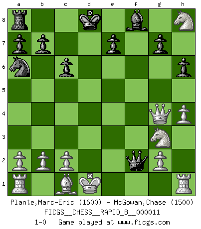 Last move : 1-0 2006 August 14 19:17:57 [Event "FICGS__CHESS__RAPID_B__000011"] [Site "FICGS"] [Date "2006.08.05"] [Round "1"] [White "Plante,Marc-Eric"] [Black "McGowan,Chase"] [Result "1-0"] [WhiteElo "1600"] [BlackElo "1500"] 1.e4 c6 2.d4 d5 3.Nc3 dxe4 4.Nxe4 Bf5 5.Ng3 Bg6 6.h4 h6 7.Nf3 Nf6 8.Ne5 Bh7 9.Bd3 Qxd4 10.Nxf7 Bxd3 11.Nxh8 Ng4 12.Qxd3 Qxf2+ 13.Kd1 Na6 14.Qg6+ Kd8 15.Qxg4 1-0 Caro-Kann : Classical, 6.h4 Player White won this chess game. Follow this game move after move (download)There must have been a time when men were demigods, or they could not have invented Chess. (Gustav Schenk) Der beste Spieler in einem Turnier gewinnt es nie. Er landet auf Platz zwei oder drei. (Siegbert Tarrasch) El Ajedrez es parte de una cultura y si una cultura esta en decadencia, entonces también el Ajedrez declinará. (Mikhail Botvinnik) Même si vous avez un bon coup à faire, regardez toujours s'il n'y en a pas un qui lui soit préférable. (Pedro Damiano) . 'gn is not allowed in chess unless n is an integer between 1 and 8 inclusive, where 1 and 8 are to interpreted as the standard numerals standing for integers in the ordered real-closed field R, with the *canonical* ordering. (As opposed to, say, an integer in the domain Z[2+i*sqrt(5)] or an integer in some exotic Grothendieck topos). (Normajean Yates)