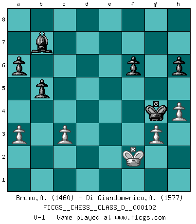 Last move : 0-1 2008 October 8 6:29:49 [Event "FICGS__CHESS__CLASS_D__000102"] [Site "FICGS"] [Date "2008.09.07"] [Round "1"] [White "Bromo,Alexis"] [Black "Di Giandomenico,Alfonso"] [Result "0-1"] [WhiteElo "1460"] [BlackElo "1577"] 1.d4 Nf6 2.c4 c5 3.Nf3 cxd4 4.Nxd4 a6 5.Nc3 e6 6.e4 Qc7 7.f4 Bb4 8.Qc2 Bxc3+ 9.bxc3 b6 10.Be2 Bb7 11.Bd3 d6 12.O-O Nbd7 13.Ba3 Nc5 14.Bxc5 Qxc5 15.e5 dxe5 16.fxe5 Qxe5 17.Rae1 Qc7 18.h3 Qc5 19.Kh1 O-O 20.Nf3 h6 21.Ne5 Qc7 22.Nf3 Nh5 23.Kg1 Rae8 24.Be2 Ng3 25.Rf2 Nxe2+ 26.R1xe2 Qxc4 27.Ne5 Qc7 28.Ng6 fxg6 29.Rxf8+ Rxf8 30.Qxg6 Qf7 31.Qxe6 Qxe6 32.Rxe6 Rf6 33.Rxf6 gxf6 34.Kf2 Kf7 35.g3 Ke6 36.Ke3 Ke5 37.h4 Kf5 38.Kf2 Kg4 39.a3 b5 0-1 Benoni defense Kingside Castling by player White (move 12) Kingside Castling by player Black (move 19) Player Black won this chess game. Follow this game move after move (download)Winning isn't everything... but losing is nothing. (Mednis) Obendrein hat der FIDE-Präsident den Revolutionsführer Gaddafi zum »Großmeister« ernannt, am Ende der WM. Das ist lächerlich! (Joel Lautier) El Ajedrez por encima de todo... ¡es una pelea!. (Emanuel Lasker) Psychologiquement, tu dois avoir confiance en toi même, mais cette confiance doit être basée sur des faits. (Robert Fischer) The intuitive mind is a sacred gift; the rational mind is a faithful servant. We have created a society that honors the servant but has forgotten the gift. (Albert Einstein)