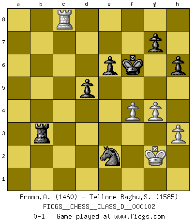 Last move : 0-1 2009 January 26 13:27:13 [Event "FICGS__CHESS__CLASS_D__000102"] [Site "FICGS"] [Date "2008.09.07"] [Round "1"] [White "Bromo,Alexis"] [Black "Tellore Raghu,Shyam Sundar"] [Result "0-1"] [WhiteElo "1460"] [BlackElo "1585"] 1.d4 d5 2.c4 c6 3.e3 Bf5 4.Nc3 e6 5.Nf3 Bd6 6.c5 Bc7 7.Bd3 b6 8.b4 a5 9.bxa5 bxc5 10.dxc5 Rxa5 11.Bxf5 exf5 12.Qd4 Nf6 13.O-O O-O 14.h3 Nbd7 15.Na4 Qa8 16.Nc3 Nxc5 17.Bd2 Ne6 18.Qd3 Ra7 19.Qxf5 c5 20.Ng5 Nxg5 21.Qxg5 h6 22.Qf5 Qc6 23.Rfb1 Qe6 24.Qxe6 fxe6 25.Nb5 Rb7 26.Nxc7 Rxc7 27.a4 c4 28.Ra3 Ne4 29.Be1 c3 30.Rc1 c2 31.a5 Rb8 32.Ra2 Rb1 33.R1xc2 Rxe1+ 34.Kh2 Rf7 35.f4 Rxe3 36.Rc8+ Kh7 37.a6 Ra7 38.Rc6 Nc3 39.Rb2 Ne2 40.Rb7 Nd4 41.R6c7 Rxb7 42.axb7 Rb3 43.Re7 Kg6 44.g4 Kf6 45.Re8 Rxb7 46.Rc8 Rb2+ 47.Kg3 Rb3+ 48.Kg2 Ne2 0-1 QGD Slav defense Kingside Castling by player White (move 13) Kingside Castling by player Black (move 13) Player Black won this chess game. Follow this game move after move (download)No price is too great for the scalp of the enemy King. (Koblentz) Zu meiner Zeit war ein 20 jähriger ein junger Spieler, heute ist er ein Veteran. (Garry Kasparov) Muchos se han convertido en Maestros de Ajedrez, nadie se ha convertido en el Maestro del Ajedrez. (Siegbert Tarrasch) La vérité est comme le meilleur coup aux échecs : elle existe, mais il faut la chercher. (Arturo Perez-Reverte) If you lose the game you should win the analysis! (Proverb)