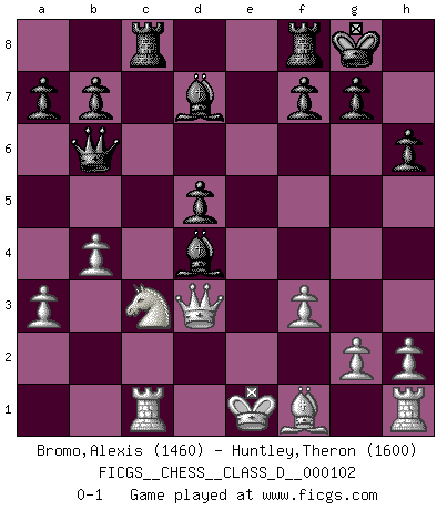 Last move : 0-1 2008 September 14 15:7:9 [Event "FICGS__CHESS__CLASS_D__000102"] [Site "FICGS"] [Date "2008.09.07"] [Round "1"] [White "Bromo,Alexis"] [Black "Huntley,Theron"] [Result "0-1"] [WhiteElo "1460"] [BlackElo "1600"] 1.c4 Nf6 2.d4 e6 3.Nc3 c5 4.Nf3 cxd4 5.Nxd4 d5 6.Bg5 Be7 7.f3 O-O 8.e3 Nc6 9.a3 h6 10.Bh4 Bd7 11.Bxf6 Bxf6 12.cxd5 Nxd4 13.exd4 Qb6 14.b4 Bxd4 15.Qd3 Rac8 16.Rc1 exd5 0-1 English, 1...Nf6 (Anglo-Indian defense) Kingside Castling by player Black (move 7) Player Black won this chess game. Follow this game move after move (download)By the beauty of his games, the clarity of his play, and the brilliance of his ideas, Fischer made himself an artist of the same stature as Brahms, Rembrandt, and Shakespeare. (David Levy) Ohne Leiden bildet sich kein Charakter. (Ernst Freiherr von Feuchtersleben) El Ajedrez hace al hombre ser mas sabio y ver mas claro. (Vladimir Putin) En blitz, le Cavalier l'emporte sur le Fou. (Vlastimil Hort) Success without honor is an unseasoned dish; it will satisfy your hunger, but it won't taste good. (Joe Paterno)