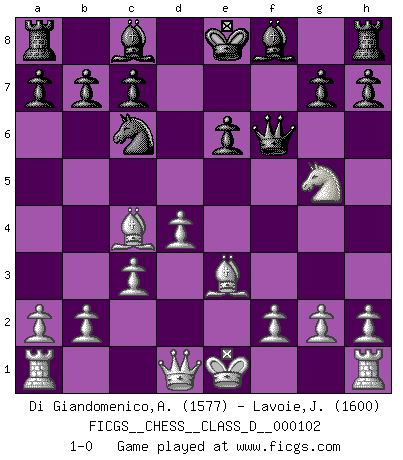 Last move : 1-0 2008 December 10 14:6:25 [Event "FICGS__CHESS__CLASS_D__000102"] [Site "FICGS"] [Date "2008.09.07"] [Round "1"] [White "Di Giandomenico,Alfonso"] [Black "Lavoie,Justin"] [Result "1-0"] [WhiteElo "1577"] [BlackElo "1600"] 1.e4 d6 2.d4 Nf6 3.Nc3 d5 4.e5 Ne4 5.Nxe4 dxe4 6.Bc4 e6 7.Nh3 Nc6 8.c3 f6 9.exf6 Qxf6 10.Ng5 e3 11.Bxe3 1-0 This chess game has been lost on time (started : 2008.09.07 13:51:25) Pirc defense Player White won this chess game. Follow this game move after move (download)The only thing Chess players have in common is Chess. (Lodewijk Prins) Garry Kasparov war erst in der Großmeister-Organisation GMA, dann in der Profischach-Vereinigung PCA, zum Schluss kehrte er wieder in den Schoß der FIDE zurück. Aber gut, manche Leute sind flexibel (Viswanathan Anand) El Rey es una pieza de pelea. ¡Usenlo!. (Wilhelm Steinitz) Je ne suis pas le dernier à jouer lâchement des coups douteux pendant le zeïtnot de l'adversaire pour l'achever: en effet les coups qui font le plus peur sont ceux que l'on ne comprend pas. Je me fais souvent peur quand je joue. (Un professeur anonyme) It is not enough to be a good player... you must also play well. (Siegbert Tarrasch)