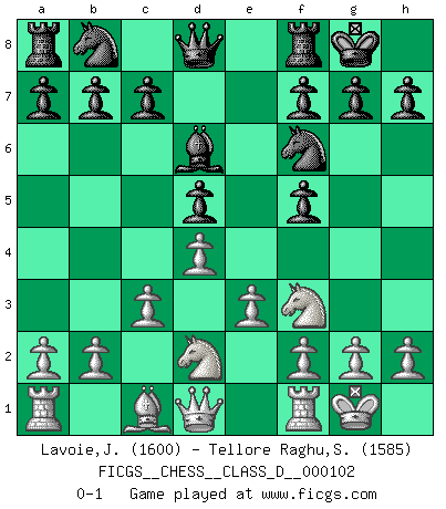 Last move : 0-1 2008 October 24 0:36:30 [Event "FICGS__CHESS__CLASS_D__000102"] [Site "FICGS"] [Date "2008.09.07"] [Round "1"] [White "Lavoie,Justin"] [Black "Tellore Raghu,Shyam Sundar"] [Result "0-1"] [WhiteElo "1600"] [BlackElo "1585"] 1.d4 d5 2.e3 Bf5 3.Bd3 e6 4.Nf3 Bb4+ 5.c3 Bd6 6.Bxf5 exf5 7.O-O Nf6 8.Nbd2 O-O 0-1 This chess game has been lost on time (started : 2008.09.07 13:51:25) Queen's pawn game Kingside Castling by player White (move 7) Kingside Castling by player Black (move 8) Player Black won this chess game. Follow this game move after move (download)Excellence at Chess is one mark of a scheming mind. (Sir Arthur Conan Doyle) Ich würde mich als ganz normalen Jungen bezeichnen [Im Alter von 12]. (Sergej Karjakin) Cuando tengas duda... ¡juega al Ajedrez!. (Tevis) J'apprécie les joueurs d'est-indienne, c'est grâce à eux que je nourris ma famille depuis tant d'années. (Petrosian) It is not titles that honor men, but men that honor titles. (Niccolo Machiavelli)