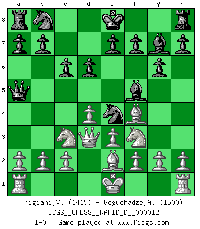 Last move : 1-0 2008 October 31 19:20:57 [Event "FICGS__CHESS__RAPID_D__000012"] [Site "FICGS"] [Date "2008.09.08"] [Round "1"] [White "Trigiani,Vincenzo"] [Black "Geguchadze,Alexander"] [Result "1-0"] [WhiteElo "1419"] [BlackElo "1500"] 1.d4 Nf6 2.Bf4 d6 3.Nc3 g6 4.Nb5 Bg7 5.e3 c6 6.Nc3 Qa5 7.Nf3 Ne4 8.Qd3 Bf5 9.Be2 1-0 This chess game has been lost on time (started : 2008.09.08 16:39:51) Queen's pawn game Player White won this chess game. Follow this game move after move (download)The older I grow, the more I value pawns. (Paul Keres) Bobby Fischer ist kein Vorbild für die heutige Jugend. (Viktor Kortschnoi) El Ajedrez demanda una total concentración. (Bobby Fischer) Botvinnik disait en comparant les échecs à la musique: Il existe une science dont le but est l'étude de l'acoustique et des sons. Mais il y a aussi un art qui se sert de l'océan des sons : c'est la musique. De toute évidence, il en est de même pour la pensée. La logique est l'étude des lois de la réflexion et les échecs reflètent, en tant qu'art, le côté logique de la réflexion, sous la forme d'images artistiques... Extrait de Fischer - Spassky, Reykjavik 1972 par Alexander & F. Wyndham (Ed. Solar), p 37. Somewhere in the world there is an epigram for every dilemma. (Hendrik Willem van Loon)