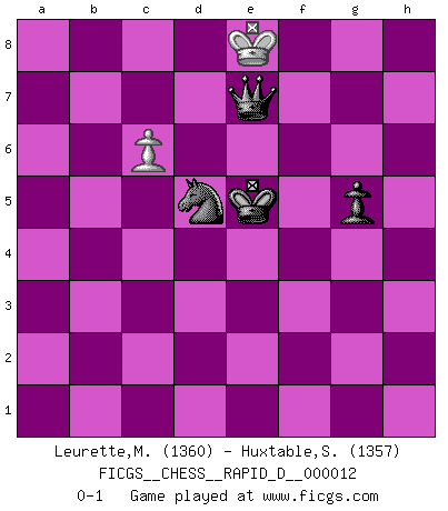 Last move : 0-1 2008 September 19 22:7:40 [Event "FICGS__CHESS__RAPID_D__000012"] [Site "FICGS"] [Date "2008.09.08"] [Round "1"] [White "Leurette,Marc-Antoine"] [Black "Huxtable,Simon"] [Result "0-1"] [WhiteElo "1360"] [BlackElo "1357"] 1.e4 c6 2.d4 d5 3.Nc3 dxe4 4.Nxe4 Bf5 5.Bd3 Bxe4 6.Bxe4 Nf6 7.Qe2 Qxd4 8.f3 e6 9.c3 Qd8 10.Bg5 Be7 11.Qd3 Nxe4 12.Qxd8+ Bxd8 13.Bxd8 Kxd8 14.fxe4 Nd7 15.O-O-O Kc7 16.Nf3 e5 17.Ng5 Raf8 18.g4 h6 19.Nf3 Re8 20.h3 Nc5 21.Rhe1 f6 22.b4 Ne6 23.Kb2 Rd8 24.Rd2 Nf4 25.Red1 Rxd2+ 26.Rxd2 Nxh3 27.Nh4 Ng5 28.Ng6 Rd8 29.Re2 Rd3 30.Rg2 Nxe4 31.c4 Rd2+ 32.Rxd2 Nxd2 33.c5 Nc4+ 34.Kb3 Ne3 35.Nf8 Kc8 36.a4 Nxg4 37.Ne6 g5 38.Ng7 h5 39.Nxh5 Kd7 40.Ng7 Ne3 41.Nh5 f5 42.b5 Ke6 43.Ng7+ Kd5 44.Kb4 f4 45.bxc6 bxc6 46.Ne8 Ke4 47.Nd6+ Kd3 48.Nc8 f3 49.Nxa7 f2 50.Nxc6 f1=Q 51.Nxe5+ Ke4 52.Ka5 Kxe5 53.c6 Qe1+ 54.Kb6 Nd5+ 55.Kb7 Qb4+ 56.Kc8 Qxa4 57.Kd7 Qa7+ 58.Ke8 Qe7+ 0-1 Caro-Kann : Classical variation Queenside Castling by player White (move 15) 10 pieces endgame at move 49 : White KNPP , Black KNPPPP WHITE : King + 1 Knight 2 Pawns BLACK : King + 1 Knight 4 Pawns 9 pieces endgame at move 50 : White KNPP , Black KNPPP WHITE : King + 1 Knight 2 Pawns BLACK : King + 1 Knight 3 Pawns Promotion Queen by player Black (move 50) 8 pieces endgame at move 51 : White KNPP , Black KQNP WHITE : King + 1 Knight 2 Pawns BLACK : King + 1 Queen 1 Knight 1 Pawn 7 pieces endgame at move 52 : White KPP , Black KQNP WHITE : King + 2 Pawns BLACK : King + 1 Queen 1 Knight 1 Pawn 6 pieces endgame at move 56 : White KP , Black KQNP WHITE : King + 1 Pawn BLACK : King + 1 Queen 1 Knight 1 Pawn Player Black won this chess game. Follow this game move after move (download)After black's reply to 1.e4 with 1..e5, leaves him always trying to get into the game. (Howard Staunton) Kann Schach nicht schließlich das Nationalspiel der Deutschen werden? Und welche weiteren Ausblicke bieten sich dann dar! Welche Hebung des allgemeinen Kultur-Niveaus, ja der Moral, wenn das Schachbrett den Kartentisch verdrängen würde! Wahrlich, ein Ziel, des Schweißes der Edlen wert! (Siegbert Tarrasch) No es una movida, aún la mejor movida que tu debas buscar, sino un plan comprensible. (Eugene Znosko-Borovsky) Nous sommes les pions de la mystérieuse partie d'Echecs jouée par Dieu. Il nous déplace, nous arrête, nous pousse encore, puis nous lance un à un dans la boîte du Néant. Epitaphe sur la tombe de David Janowsky (1868-1927). A computer lets you make more mistakes faster than any invention in human history - with the possible exceptions of handguns and tequila. (Mitch Ratcliffe)