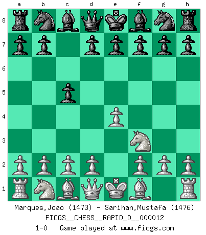 Last move : 1-0 2008 October 11 11:17:35 [Event "FICGS__CHESS__RAPID_D__000012"] [Site "FICGS"] [Date "2008.09.08"] [Round "1"] [White "Marques,Joao"] [Black "Sarihan,Mustafa"] [Result "1-0"] [WhiteElo "1473"] [BlackElo "1476"] 1.e4 c5 2.Nf3 1-0 This chess game has been lost on time (started : 2008.09.08 16:39:51) Sicilian defense Player White won this chess game. Follow this game move after move (download)The combination player thinks forward; he starts from the given position, and tries the forceful moves in his mind. (Emanuel Lasker) Verschiedene, sehr schätzbare und im Laufe des Lebens nützliche Eigenschaften des Geistes können durch das Schachspiel erworben und gekräftigt werden, so dass sie zu Gewohnheiten werden, die uns nie im Stich lassen. (Benjamin Franklin) Algunos sacrificios son sólidos, los demás son míos. (Mikhail Tal) Tous ces prétendus hommes politiques sont les pions, les Cavaliers, les Tours ou les Fous d'une partie d'échecs qui se jouera tant qu'un hasard ne renversera pas l'échiquier. (Honoré de Balzac) The ego is not master in its own house. (Sigmund Freud)