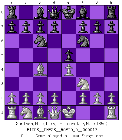 Last move : 0-1 2008 October 11 23:18:20 [Event "FICGS__CHESS__RAPID_D__000012"] [Site "FICGS"] [Date "2008.09.08"] [Round "1"] [White "Sarihan,Mustafa"] [Black "Leurette,Marc-Antoine"] [Result "0-1"] [WhiteElo "1476"] [BlackElo "1360"] 1.e4 e5 2.Nf3 Nc6 3.Bc4 Nf6 0-1 This chess game has been lost on time (started : 2008.09.08 16:39:51) Two knights defense Player Black won this chess game. Follow this game move after move (download)Personally, I rather look forward to a computer program winning the world Chess Championship. Humanity needs a lesson in humility. (Richard Dawkings) Der Partner hat auch seine Existenzberechtigung. (Savielly Grigorievitsch Tartakower) En partidas rápidas, el Caballo es mas poderoso que el Alfil. (Vlastimil Hort) Le thème de l'attaque double intervient d'une manière ou d'une autre dans l'immense majorité des combinaisons. (Youri Averbakh) When you stop learning you start dying. (M. Scott Adams)