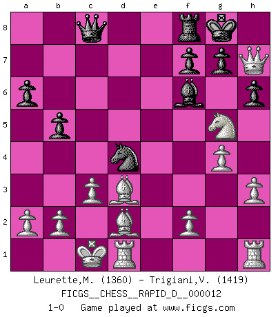 Last move : 1-0 2008 September 22 18:9:6 [Event "FICGS__CHESS__RAPID_D__000012"] [Site "FICGS"] [Date "2008.09.08"] [Round "1"] [White "Leurette,Marc-Antoine"] [Black "Trigiani,Vincenzo"] [Result "1-0"] [WhiteElo "1360"] [BlackElo "1419"] 1.e4 e5 2.Nf3 Nf6 3.Nc3 Nc6 4.Bc4 d6 5.d4 Be7 6.dxe5 Bg4 7.exf6 Bxf6 8.h3 Bh5 9.g4 Bg6 10.Qe2 O-O 11.Bd2 Qe8 12.O-O-O a6 13.Ng5 Nd4 14.Qe1 b5 15.Bd3 d5 16.Nxd5 h6 17.Nxc7 Qc6 18.Nxa8 Qxa8 19.c3 Bxe4 20.Qxe4 Qc8 21.Qh7+ 1-0 Petrov Three knights game Kingside Castling by player Black (move 10) Queenside Castling by player White (move 12) Player White won this chess game. Follow this game move after move (download)Chess is not like life... it has rules ! (Mark Pasternak) Als er Schachweltmeister wurde ließ er praktisch alle stärksten Sovietspieler für sich arbeiten. Wenn ein auch nur mittelmässiger Meister ein Spezialist für eine bestimmte Eröffnung war, wurde er von Karpov gerufen. Das wurde alles geheim gehalten. (Mikhail Moiseyevich Botvinik) Las combinaciones han sido siempre el aspecto más intrigante del Ajedrez. Los Maestros las buscan, el público las aplauden, los críticos las alaban. La razón se debe a que las combinaciones hacen posible que el Ajedrez sea más que un ejercicio matemático con una carencia de vida. Ellas son la poesía del juego, son del Ajedrez lo que la melodía es de la música. Ellas representan el triunfo de la mente sobre la materia. (Reuben Fine) Des idées, des idées, j'en ai cent, j'en ai mille. Des bonnes, des mauvaises, applicables, irréalisables... Il suffit de faire le tri ! (Roos) Experiences are the keys to life. (Daniel Parmet)