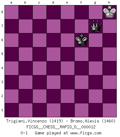Last move : 0-1 2008 November 6 13:36:9 [Event "FICGS__CHESS__RAPID_D__000012"] [Site "FICGS"] [Date "2008.09.08"] [Round "1"] [White "Trigiani,Vincenzo"] [Black "Bromo,Alexis"] [Result "0-1"] [WhiteElo "1419"] [BlackElo "1460"] 1.d4 d5 2.Bf4 c5 3.Nc3 e6 4.Nb5 Na6 5.Nc7+ Nxc7 6.dxc5 Bxc5 7.e3 Nf6 8.Nf3 h6 9.a4 b6 10.Bb5+ Bd7 11.O-O Nxb5 12.Ne5 Nd6 13.b3 O-O 14.Nd3 Nde4 15.Nxc5 bxc5 16.Be5 Bc6 17.f3 Nd6 18.e4 d4 19.Qd2 Nd7 20.Bxd6 Re8 21.e5 Nb6 22.Rae1 Nd5 23.Bxc5 Ne3 24.Rf2 Qg5 25.Bxd4 Nxg2 26.Rxg2 Qxd2 27.Rxd2 Bxf3 28.Kf2 Bb7 29.h4 h5 30.c4 Rf8 31.Bc5 Rfc8 32.Rd7 Rxc5 33.Rxb7 Kf8 34.Rd7 Ke8 35.Rd4 Rd8 36.Red1 Rxd4 37.Rxd4 Rxe5 38.Rd6 a5 39.c5 Rxc5 40.Ra6 Rc2+ 41.Kf3 Rc3+ 42.Ke4 Rxb3 43.Ra8+ Ke7 44.Ra7+ Kf6 45.Rxa5 Rb4+ 46.Kf3 Rxh4 47.Rb5 Rxa4 48.Rxh5 Kg6 49.Re5 Kf6 50.Rh5 g5 51.Rh6+ Kf5 52.Rh5 Rh4 53.Rxh4 gxh4 54.Kg2 Kf4 55.Kh3 e5 56.Kxh4 e4 57.Kh5 e3 58.Kh6 e2 59.Kg7 e1Q 60.Kxf7 Qe5 61.Kg6 Qf5+ 62.Kh6 Qg5+ 63.Kh7 Kf5 64.Kh8 Kf6 65.Kh7 Qg6+ 66.Kh8 Qg7+ 0-1 Queen's pawn, Mason variation, Steinitz counter-gambit Kingside Castling by player White (move 11) Kingside Castling by player Black (move 13) 10 pieces endgame at move 45 : White KRPP , Black KRPPPP WHITE : King + 1 Rook 2 Pawns BLACK : King + 1 Rook 4 Pawns 9 pieces endgame at move 46 : White KRP , Black KRPPPP WHITE : King + 1 Rook 1 Pawn BLACK : King + 1 Rook 4 Pawns 8 pieces endgame at move 47 : White KR , Black KRPPPP WHITE : King + 1 Rook BLACK : King + 1 Rook 4 Pawns 7 pieces endgame at move 48 : White KR , Black KRPPP WHITE : King + 1 Rook BLACK : King + 1 Rook 3 Pawns 6 pieces endgame at move 53 : White KR , Black KPPP WHITE : King + 1 Rook BLACK : King + 3 Pawns 5 pieces endgame at move 53 : White K , Black KPPP WHITE : King + BLACK : King + 3 Pawns 4 pieces endgame at move 56 : White K , Black KPP WHITE : King + BLACK : King + 2 Pawns Promotion Queen by player Black (move 59) 3 pieces endgame at move 60 : White K , Black KQ WHITE : King + BLACK : King + 1 Queen Player Black won this chess game. Follow this game move after move (download)Castle early and often. (Rob Sillars) Frage: Wie viele Autos haben Sie schon zerstört? - Antwort: Nur zwei. (Loek van Wely) Un entendimiento a fondo de las continuaciones típicas del mate, hace de las combinaciones de sacrificio mas complicadas conducirlas a ellas no solo sin dificultad, sino casi de una manera natural. (Siegbert Tarrasch) Un journaliste : 'Vous préférez avoir une dame de plus sur l'échiquier ou au lit ?' Boris Spassky : 'Ca dépend de la position.' Inventor: A person who makes an ingenious arrangement of wheels, levers and springs, and believes it civilization. (Ambrose Bierce, The Devil's Dictionary)