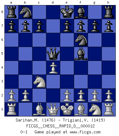 Last move : 0-1 2008 October 13 11:21:42 [Event "FICGS__CHESS__RAPID_D__000012"] [Site "FICGS"] [Date "2008.09.08"] [Round "1"] [White "Sarihan,Mustafa"] [Black "Trigiani,Vincenzo"] [Result "0-1"] [WhiteElo "1476"] [BlackElo "1419"] 1.d4 d5 2.c4 Nf6 3.cxd5 Qxd5 4.Nc3 Bf5 0-1 This chess game has been lost on time (started : 2008.09.08 16:39:51) QGD : Marshall defense Player Black won this chess game. Follow this game move after move (download)Chess, like love, like music, has the power to make people happy. (Siegbert Tarrasch) Als ich elf wurde, wurde ich einfach gut. (Robert James Fischer) Ciertamente el estado mental actual de Bobby Fischer es una tragedia. Uno de los mas grandes jugadores de Ajedrez del mundo -el orgullo y pena del Ajedrez Americano. (Frank Brady) Les échecs, c'est la lutte contre l'erreur. (Johannes Zukertort) Wisdom doesn't necessarily come with age. Sometimes age just shows up all by itself. (Tom Watson)