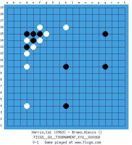 Last move : 0-1 2008 November 3 19:40:4 [Event "FICGS__GO__TOURNAMENT_KYU__000068"] [Site "FICGS"] [Date "2008.09.08"] [Round "1"] [Black "Harris,Cal"] [White "Bromo,Alexis"] [Result "0-1"] [Rating 1 "0963"] 1.k10 d10 2.k4 k16 3.q10 d4 4.q15 f14 5.e15 d14 6.d15 f16 7.f15 g15 8.e14 e13 9.d13 d12 0-1 This go game has been lost on time (started : 2008.09.08 16:55:43) Here are the names of the openings (joseki) played in the four corners : Corner d16 : f14 e15 This joseki is unknown. A weak or weird move has probably been played in this corner. Corner d4 : d4 0-1 Hoshi (Hwajeom, Seongjeom, Xingwei`) 4-4 Point. The star or hoshi (4-4) point, emphasizing influence at the potential expense of territory. Player White won this Go (weiqi, baduk) game. Follow this game move after move (download)Ikken tobi is never wrong. (Anonymous) Man is still the most extraordinary computer of all. (John F. Kennedy)