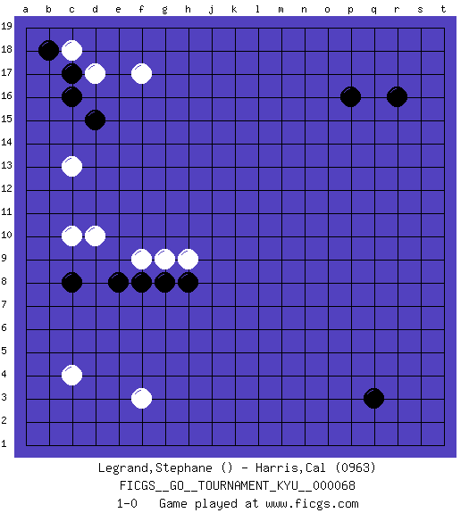 Last move : 1-0 2008 October 24 12:36:58 [Event "FICGS__GO__TOURNAMENT_KYU__000068"] [Site "FICGS"] [Date "2008.09.08"] [Round "1"] [Black "Legrand,Stephane"] [White "Harris,Cal"] [Result "1-0"] [Rating 2 "0963"] 1.r16 c4 2.q3 d17 3.p16 f3 4.d15 c13 5.c17 c18 6.c16 f17 7.b18 d10 8.c8 c10 9.e8 f9 10.f8 g9 11.g8 h9 12.h8 1-0 This go game has been lost on time (started : 2008.09.08 16:55:43) Here are the names of the openings (joseki) played in the four corners : Corner d16 : d17 d15 Komoku (Somok, Xiao~mu`) 3-4 Point. The komoku (3-4) point is the traditional corner enclosure move.. Ikken Takagakari (Hankan Nop'dakeolch'im, Yi Gaogua`jiao~, 1-Space High Approach). The 5-4 approach move has become more popular in modern times, as modern Go emphasizes speed and influence. Player Black won this Go (weiqi, baduk) game. Follow this game move after move (download)With only one group, you will win. (Anonymous) Tree pose grows confidence. It roots me to this world. (Terri Guillemets)
