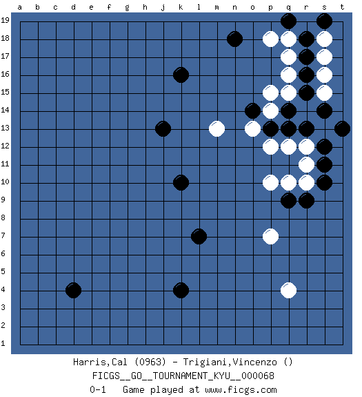 Last move : 0-1 2008 November 13 9:0:24 [Event "FICGS__GO__TOURNAMENT_KYU__000068"] [Site "FICGS"] [Date "2008.09.08"] [Round "1"] [Black "Harris,Cal"] [White "Trigiani,Vincenzo"] [Result "0-1"] [Rating 1 "0963"] 1.k10 q16 2.k16 q10 3.k4 q4 4.l7 p7 5.j13 m13 6.r17 s17 7.r16 s16 8.r15 q15 9.q14 r14 10.q13 s15 11.r13 q17 12.r18 s18 13.s14 q18 14.s19 r19 15.q19 q12 16.d4 p18 17.n18 s13 18.s12 r12 19.s11 r11 20.s10 r10 21.r9 p12 22.q9 p15 23.o14 p14 24.p13 o13 25.t13 p10 0-1 This go game has been lost on time (started : 2008.09.08 16:55:43) Here are the names of the openings (joseki) played in the four corners : Corner q4 : q4 l7 Hoshi (Hwajeom, Seongjeom, Xingwei`) 4-4 Point. The star or hoshi (4-4) point, emphasizing influence at the potential expense of territory. Player White won this Go (weiqi, baduk) game. Follow this game move after move (download)The rectangular six is normally alive. (Anonymous) Rules and bones are meant to be broken. (Anonymous)