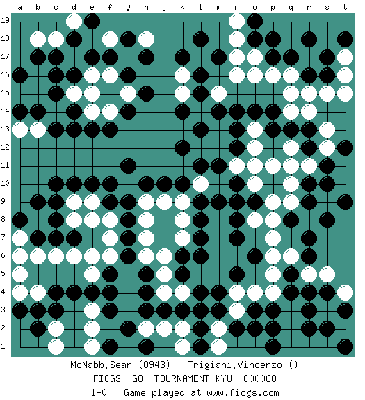 Last move : 1-0 2009 March 13 10:37:50 [Event "FICGS__GO__TOURNAMENT_KYU__000068"] [Site "FICGS"] [Date "2008.09.08"] [Round "1"] [Black "McNabb,Sean"] [White "Trigiani,Vincenzo"] [Result "1-0"] [Rating 1 "0943"] 1.r16 q16 2.q17 q15 3.p17 r15 4.s16 p16 5.d16 o16 6.q4 o17 7.o18 s15 8.r18 n18 9.p18 t15 10.d4 n19 11.o19 n17 12.r10 d17 13.e17 p5 14.q5 p6 15.r7 p7 16.o3 p4 17.p3 o4 18.m3 t16 19.s17 t17 20.t18 n4 21.m4 n3 22.n2 m2 23.o2 q3 24.r3 q2 25.r2 m5 26.l2 m1 27.l1 r1 28.s4 q6 29.r6 r8 30.q8 q9 31.r9 p8 32.s8 l5 33.h17 q10 34.k10 q11 35.n10 r11 36.s11 p11 37.n12 n11 38.m11 k4 39.k3 k2 40.j3 j2 41.h3 k1 42.l3 j4 43.h4 j5 44.h5 h2 45.g2 h6 46.g6 f6 47.g7 h7 48.g8 h8 49.g9 h9 50.h10 g5 51.f5 f7 52.g11 f8 53.f9 g10 54.f10 j9 55.j10 l10 56.l11 o11 57.l9 k9 58.l8 s12 59.k6 k7 60.l7 m6 61.l6 j6 62.k5 m7 63.l4 m8 64.m9 s3 65.s2 s1 66.p2 q1 67.p1 t2 68.t3 t10 69.s10 t11 70.t9 k8 71.n8 o8 72.n7 n9 73.o9 p9 74.n5 n6 75.o6 e16 76.c16 b16 77.c17 c18 78.d18 g4 79.f4 g3 80.f3 g1 81.f1 e8 82.d10 e9 83.e10 d9 84.d7 d6 85.c7 e6 86.c9 d8 87.c8 c6 88.c4 b6 89.c10 a6 90.a8 b8 91.b7 a7 92.b9 a5 93.b3 e5 94.e4 e3 95.n14 e2 96.p13 s13 97.l16 a4 98.a3 e1 99.h1 r5 100.r4 s5 101.r13 r14 102.q13 o13 103.o14 m13 104.n13 m12 105.r12 q12 106.m14 o12 107.p14 q14 108.t12 t4 109.t1 e15 110.d13 d15 111.c15 b15 112.b14 c14 113.c13 b13 114.b17 b18 115.a16 a15 116.a14 a13 117.d14 d19 118.e19 f18 119.f17 g17 120.g18 h18 121.g16 g15 122.h15 e14 123.e13 f14 124.g14 f16 125.f13 m15 126.l15 n16 127.l18 o10 128.n9 b4 129.c3 c2 130.b2 c1 131.pass l14 132.l13 l12 133.k12 k15 134.k14 k16 135.k17 l17 136.m17 1-0 Here are the names of the openings (joseki) played in the four corners : Corner q16 : r16 q16 Komoku (Somok, Xiao~mu`) 3-4 Point. The komoku (3-4) point is the traditional corner enclosure move.. Corner d16 : d16 d17 Hoshi (Hwajeom, Seongjeom, Xingwei`) 4-4 Point. The star or hoshi (4-4) point, emphasizing influence at the potential expense of territory. Corner q4 : q4 p5 Hoshi (Hwajeom, Seongjeom, Xingwei`) 4-4 Point. The star or hoshi (4-4) point, emphasizing influence at the potential expense of territory. Player Black won this Go (weiqi, baduk) game. Follow this game move after move (download)The weak player fears ko, the strong player seeks it. (Bill Taylor) Political correctness is subjecting us to gross incompetence. (Johann Piek)