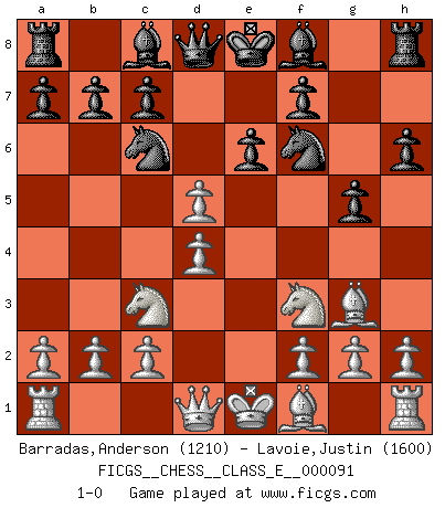 Last move : 1-0 2008 November 7 8:7:4 [Event "FICGS__CHESS__CLASS_E__000091"] [Site "FICGS"] [Date "2008.09.08"] [Round "1"] [White "Barradas,Anderson"] [Black "Lavoie,Justin"] [Result "1-0"] [WhiteElo "1210"] [BlackElo "1600"] 1.e4 d6 2.d4 Nf6 3.Nc3 e6 4.Bg5 h6 5.Bh4 Nc6 6.Nf3 g5 7.Bg3 d5 8.exd5 1-0 This chess game has been lost on time (started : 2008.09.08 21:37:40) Pirc defense Player White won this chess game. Follow this game move after move (download)No one ever won a game by resigning. (Unknown) Offensichtlich kennt Kasparow nichts anderes als Schach, und ich könnte 500 weitere Spieler dieser Sorte benennen. (Judith Polgar) Bobby es la celebridad menos entendida y malinterpretada que camina el la faz de esta tierra. (Yasser Seirawan) Ce qui caractérise les parties de combat, c'est que si le défenseur a constamment de difficiles problèmes à résoudre, l'attaquant doit chercher sans relâche de nouvelles possibilités d'attaque. (Koblentz) True nature is revealed in times of difficulty. (Chinese proverb)