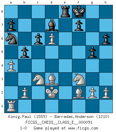 Last move : 1-0 2008 October 15 20:48:58 [Event "FICGS__CHESS__CLASS_E__000091"] [Site "FICGS"] [Date "2008.09.08"] [Round "1"] [White "Konig,Paul"] [Black "Barradas,Anderson"] [Result "1-0"] [WhiteElo "1559"] [BlackElo "1210"] 1.c4 d5 2.cxd5 Qxd5 3.Nc3 Qd8 4.d4 e6 5.e4 Bb4 6.d5 exd5 7.exd5 Nf6 8.Qa4+ Bd7 9.Qxb4 Qe7+ 10.Qxe7+ Kxe7 11.Nf3 Re8 12.Bf4 Kf8 13.Kd2 c6 14.d6 h6 15.Bd3 g5 16.Be3 Ng4 17.Bd4 Nxf2 18.Bxf2 b5 19.Rhe1 Na6 20.Rxe8+ Rxe8 21.a4 1-0 English Opening Player White won this chess game. Follow this game move after move (download)What is the difference between chess and football? Everybody understands football, but nobody plays it. Everybody plays chess, but nobody understands it. Everything is relative. (Vladimir Kramnik) Ohne ihre Erfolge schmälern zu wollen würde ich sagen Petrosian, Spassky und Karpov verdanken ihre Siege ihren Trainern - Boleslavsky, Bondarevsky und Furman. (Mikhail Moiseyevich Botvinik) El Ajedrez no es una pizca de inferior al violín, y tenemos un gran número de violinistas profesionales. (Mikhail Botvinnik) La menace est plus forte que l'exécution. (Aaron Nimzovitch) There are 10 types of people in this world: those who understand binary and those who don't. (Anonymous)