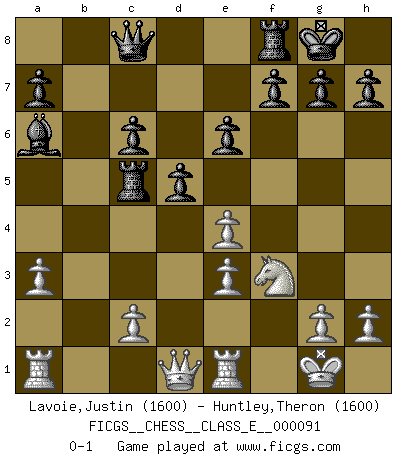 Last move : 0-1 2008 December 10 14:6:25 [Event "FICGS__CHESS__CLASS_E__000091"] [Site "FICGS"] [Date "2008.09.08"] [Round "1"] [White "Lavoie,Justin"] [Black "Huntley,Theron"] [Result "0-1"] [WhiteElo "1600"] [BlackElo "1600"] 1.d4 d5 2.e3 Nf6 3.Nf3 c5 4.Bb5+ Nc6 5.Bxc6+ bxc6 6.O-O e6 7.Nc3 Bb7 8.dxc5 Bxc5 9.Qd3 Qc8 10.Qd1 Ba6 11.Re1 O-O 12.e4 Ng4 13.Be3 Nxe3 14.fxe3 Rb8 15.a3 Rxb2 16.Na4 Rb5 17.Nxc5 Rxc5 0-1 This chess game has been lost on time (started : 2008.09.08 21:37:40) Queen's pawn game Kingside Castling by player White (move 6) Kingside Castling by player Black (move 11) Player Black won this chess game. Follow this game move after move (download)The passed Pawn is a criminal, who should be kept under lock and key. Mild measures, such as police surveillance, are not sufficient. (Aaron Nimzovich) Der vorletzte Fehler gewinnt. (Savielly Grigorievitsch Tartakower) Yo creo que el Ajedrez posee una magia que es también una ayuda en la edad avanzada. Una rodilla reumática es olvidada durante una partida de Ajedrez y otros eventos pueden parecer algo sin importancia comparada a una catástrofe en el tablero de Ajedrez. (Vlastimil Hort) Il vaut mieux sacrifier les pièces de l'adversaire. (Xavier Tartacover) I fear not the man who has practiced 10,000 kicks once, but I fear the man who has practiced one kick 10,000 times. (Bruce Lee)