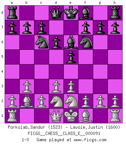 Last move : 1-0 2008 December 6 10:51:44 [Event "FICGS__CHESS__CLASS_E__000091"] [Site "FICGS"] [Date "2008.09.08"] [Round "1"] [White "Porkolab,Sandor"] [Black "Lavoie,Justin"] [Result "1-0"] [WhiteElo "1523"] [BlackElo "1600"] 1.b3 d6 2.Bb2 e5 3.d3 Nf6 4.Nd2 Be6 5.e3 Nc6 6.Ne2 1-0 This chess game has been lost on time (started : 2008.09.08 21:37:40) Nimzovich-Larsen attack Player White won this chess game. Follow this game move after move (download)Look at Garry Kasparov. After he loses, invariably he wins the next game. He just kills the next guy. That's something that we have to learn to be able to do. (Maurice Ashley) Ein Schachgenie ist jemand der verdammt gut Schach spielt. (Jonathan Levitt) Ayuda a tus piezas para que ellas te puedan ayudar. (Paul Morphy) Le plus grand jeu de l'esprit jamais inventé, plus vous l'apprenez, plus vous y prenez du plaisir. (Garry Kasparov) Games, world of games... There's always an opponent, and there's always a victim. (Revolver, movie)