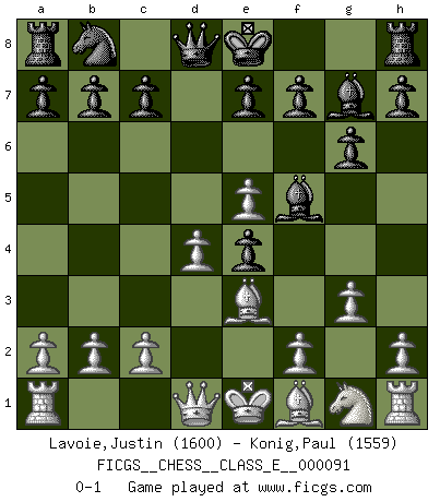 Last move : 0-1 2008 November 6 7:53:41 [Event "FICGS__CHESS__CLASS_E__000091"] [Site "FICGS"] [Date "2008.09.08"] [Round "1"] [White "Lavoie,Justin"] [Black "Konig,Paul"] [Result "0-1"] [WhiteElo "1600"] [BlackElo "1559"] 1.d4 Nf6 2.Nc3 g6 3.e4 d5 4.e5 Ne4 5.Nxe4 dxe4 6.Be3 Bg7 7.g3 Bf5 0-1 This chess game has been lost on time (started : 2008.09.08 21:37:40) Queen's pawn game Player Black won this chess game. Follow this game move after move (download)Robert Fischer is a law unto himself. (Larry Evans) Ein Kibitz ist einer, der deinem Gegner gute Ratschläge gibt. (Andrew Soltis) Durante una competencia de Ajedrez, un Maestro de Ajedrez deberá ser una combinación de presa de caza y un Monge. (Alexander Alekhine) Nous vivons dans un monde échiquéen : chaque jour qui passe est un défi à relever. (Philosophe Sasha) All art requires courage. (Anne Tucker)