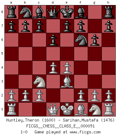 Last move : 1-0 2008 October 19 12:17:45 [Event "FICGS__CHESS__CLASS_E__000091"] [Site "FICGS"] [Date "2008.09.08"] [Round "1"] [White "Huntley,Theron"] [Black "Sarihan,Mustafa"] [Result "1-0"] [WhiteElo "1600"] [BlackElo "1476"] 1.e4 d6 2.d4 Nf6 3.Nc3 g6 4.Be3 1-0 This chess game has been lost on time (started : 2008.09.08 21:37:40) Pirc defense Player White won this chess game. Follow this game move after move (download)Excellence at Chess is one mark of a scheming mind. (Sir Arthur Conan Doyle) Ihnen, Herr Lasker, habe ich nur drei Worte zu sagen: Schach und matt. (Siegbert Tarrasch) Un mal día en el Ajedrez, es mejor que cualquier buen día en el trabajo. (Anonymous) L'attaque fait le spectacle, la défense gagne les matchs. (Dicton footballistique) There is a very easy way to return from a casino with a small fortune : go there with a large one. (Jack Yelton)