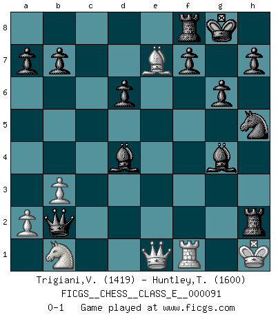 Last move : 0-1 2008 September 14 21:17:22 [Event "FICGS__CHESS__CLASS_E__000091"] [Site "FICGS"] [Date "2008.09.08"] [Round "1"] [White "Trigiani,Vincenzo"] [Black "Huntley,Theron"] [Result "0-1"] [WhiteElo "1419"] [BlackElo "1600"] 1.d4 Nf6 2.Bf4 g6 3.Nc3 Bg7 4.Nb5 d6 5.Nf3 O-O 6.Nxc7 Qxc7 7.e3 Nc6 8.Bc4 Nh5 9.Bg5 Nxd4 10.exd4 Qxc4 11.b3 Qc3+ 12.Nd2 Bg4 13.Qc1 Bxd4 14.O-O Qxa1 15.Nb1 Rac8 16.Qd2 Qb2 17.Bxe7 Rxc2 18.Qd1 Rxf2 19.Qe1 Rxg2+ 20.Kh1 Rxh2+ 0-1 Queen's pawn game Kingside Castling by player Black (move 5) Kingside Castling by player White (move 14) Player Black won this chess game. Follow this game move after move (download)When you see a good move, look for a better one. (Emanuel Lasker) Der Vorposten provoziert a) eine Basis für neue Angriffe und b) eine Schwächung der gegnerischen Widerstandskraft in der fraglichen Linie. (Aaron Nimzowitsch) Yo jugué Ajedrez con el y a veces le pude haber ganado solo que siempre devuelve su última jugada y juega la partida de manera diferente. (Mark Twain) Les réformistes prétendent que les progrès de la théorie conduiront à la disparition des échecs, et qu'il faut, pour leur rendre vie, en remanier les règles. En réalité, qu'exprime cette affirmation? Le mépris de l'intuition, de l'imagination et de tous les autres éléments qui font des échecs un art. (Alexander Alekhine) Logic : The art of thinking and reasoning in strict accordance with the limitations and incapacities of the human misunderstanding. (Ambrose Bierce)