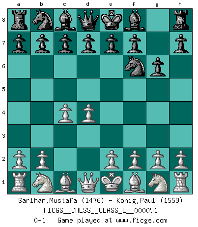 Last move : 0-1 2008 October 22 12:32:40 [Event "FICGS__CHESS__CLASS_E__000091"] [Site "FICGS"] [Date "2008.09.08"] [Round "1"] [White "Sarihan,Mustafa"] [Black "Konig,Paul"] [Result "0-1"] [WhiteElo "1476"] [BlackElo "1559"] 1.d4 Nf6 2.c4 g6 0-1 This chess game has been lost on time (started : 2008.09.08 21:37:40) King's Indian defense Player Black won this chess game. Follow this game move after move (download)There are two types of sacrifices: correct ones and mine. (Mikhail Tal) Schach ist Leben. (Robert James Fischer) El arma más poderosa en el Ajedrez, es tener la próxima movida. (David Bronstein) Vouloir jouer aux échecs contre soi-même est aussi paradoxal que vouloir marcher sur son ombre. (Stefan Zweig) Children in the dark cause accidents, accidents in the dark cause children. (Unknown)