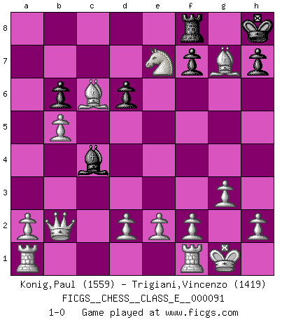 Last move : 1-0 2008 October 23 15:15:45 [Event "FICGS__CHESS__CLASS_E__000091"] [Site "FICGS"] [Date "2008.09.08"] [Round "1"] [White "Konig,Paul"] [Black "Trigiani,Vincenzo"] [Result "1-0"] [WhiteElo "1559"] [BlackElo "1419"] 1.c4 e5 2.Nc3 Bc5 3.Nf3 Nf6 4.Nxe5 Nc6 5.Nd3 O-O 6.Nxc5 d6 7.Nd3 b6 8.g3 Bg4 9.Bg2 a5 10.Bxc6 Ra6 11.O-O b5 12.cxb5 Rb6 13.b4 axb4 14.Nxb4 Qe7 15.Nbd5 Be6 16.Nxe7+ Kh8 17.Qc2 Bc4 18.Na4 Be6 19.Nxb6 cxb6 20.Bb2 Re8 21.Bxf6 Rf8 22.Qb2 Bc4 23.Bxg7+ 1-0 English Opening Kingside Castling by player Black (move 5) Kingside Castling by player White (move 11) Player White won this chess game. Follow this game move after move (download)Man is a frivolous, a specious creature, and like a Chess player, cares more for the process of attaining his goal than for the goal itself. (Dostoyevsky) Viele Opfer benötigen überhaupt keine konkrete Berechnung. Es genügt sich die entstehende Position kurz vorzustellen, um uns davon zu überzeugen, dass das Opfer korrekt ist. (Mikhail Nekhemyevich Tal) En partidas rápidas, el Caballo es mas poderoso que el Alfil. (Vlastimil Hort) Toute estimation doit être constamment réévaluée. (Jacob Estrin) There are two types of people in this world, good and bad. The good sleep better, but the bad seem to enjoy the waking hours much more. (Woody Allen)