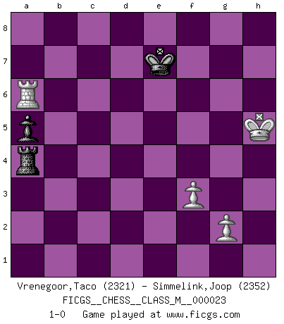 Last move : 1-0 2008 October 19 18:10:27 [Event "FICGS__CHESS__CLASS_M__000023"] [Site "FICGS"] [Date "2008.09.09"] [Round "1"] [White "Vrenegoor,Taco"] [Black "Simmelink,Joop"] [Result "1-0"] [WhiteElo "2321"] [BlackElo "2352"] 1.e4 e5 2.Nf3 Nc6 3.Bb5 a6 4.Bxc6 dxc6 5.O-O Qd6 6.Na3 Qe6 7.d4 Bxa3 8.bxa3 exd4 9.Nxd4 Qd6 10.Nb3 Nf6 11.f3 Be6 12.Qxd6 cxd6 13.Na5 Kd7 14.Nxb7 Kc7 15.Na5 Nd7 16.Bf4 f6 17.c4 Ne5 18.Rfc1 Rab8 19.c5 d5 20.Bg3 h5 21.h4 Bf7 22.exd5 Bxd5 23.Nc4 Bxc4 24.Rxc4 Rhd8 25.Re1 Rd5 26.Rce4 Rb5 27.Bxe5+ fxe5 28.Rxe5 Rbxc5 29.Rxd5 cxd5 30.Re5 g6 31.Rg5 Rc4 32.Rxd5 Rxh4 33.Ra5 Kb7 34.Rg5 Ra4 35.Rxg6 Rxa3 36.Rh6 Ra5 37.a4 Kc7 38.Kh2 Kd7 39.Kg3 Ke7 40.Kh4 Rxa4+ 41.Kxh5 a5 42.Ra6 1-0 Ruy Lopez : Exchange, Bronstein variation Kingside Castling by player White (move 5) 10 pieces endgame at move 35 : White KRPPPP , Black KRPP WHITE : King + 1 Rook 4 Pawns BLACK : King + 1 Rook 2 Pawns 9 pieces endgame at move 35 : White KRPPP , Black KRPP WHITE : King + 1 Rook 3 Pawns BLACK : King + 1 Rook 2 Pawns 8 pieces endgame at move 40 : White KRPP , Black KRPP WHITE : King + 1 Rook 2 Pawns BLACK : King + 1 Rook 2 Pawns 7 pieces endgame at move 41 : White KRPP , Black KRP WHITE : King + 1 Rook 2 Pawns BLACK : King + 1 Rook 1 Pawn Player White won this chess game. Follow this game move after move (download)I know people who have all the will in the world, but still can't play good Chess. (Bobby Fischer) Ich war zu klein für die Schach-Schülermannschaft! (Woody Allen) Debemos de asegurarnos de que el Ajedrez no se convierta en un lenguaje muerto, muy interesante, pero solo para un grupo muy pequeño. (Sytze Faber) On n'a jamais que l'âge auquel on a commence à jouer aux échecs car après on cesse de vieillir. (Capablanca) A journey of a thousand sites begins with a single click. (Author unknown)