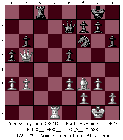 Last move : 1/2-1/2 2009 March 2 5:11:8 [Event "FICGS__CHESS__CLASS_M__000023"] [Site "FICGS"] [Date "2008.09.09"] [Round "1"] [White "Vrenegoor,Taco"] [Black "Mueller,Robert"] [Result "1/2-1/2"] [WhiteElo "2321"] [BlackElo "2257"] 1.Nf3 Nf6 2.c4 e6 3.g3 d5 4.Bg2 dxc4 5.Qa4+ Bd7 6.Qxc4 c5 7.Ne5 Qc8 8.b3 Nc6 9.Nxd7 Qxd7 10.Bb2 Be7 11.O-O O-O 12.d3 Rfd8 13.Nd2 Rac8 14.Rad1 b6 15.Rfe1 Ne8 16.Qc1 Bf6 17.Qa1 Bxb2 18.Qxb2 Nf6 19.Nf3 Qd5 20.Rc1 h6 21.Rc4 Qd6 22.a3 a5 23.Rd1 Rc7 24.R4c1 Nd4 25.e3 Nxf3+ 26.Bxf3 Rdc8 27.d4 cxd4 28.Rxc7 Qxc7 29.Qxd4 e5 30.Qd3 Qe7 31.Qb5 1/2-1/2 Reti Opening Kingside Castling by player White (move 11) Kingside Castling by player Black (move 11) This chess game ended in a draw. Follow this game move after move (download)The older I grow, the more I value pawns. (Paul Keres) Rauchen ist dem Schachspieler bei seiner Arbeit, also im Wettkampf, untersagt. (Viktor Kortschnoi) El Ajedrez es imaginación. (David Bronstein) Un millionnaire : 'Monsieur Steinitz ! Vous ne participez aux tournois que pour l'argent, alors que moi je n'y viens que pour l'honneur.' Steinitz : 'Chacun joue pour ce qu'il n'a pas'... Convictions are more dangerous enemies of truth than lies. (Friedrich Nietzsche)