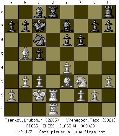 Last move : 1/2-1/2 2008 September 25 21:28:47 [Event "FICGS__CHESS__CLASS_M__000023"] [Site "FICGS"] [Date "2008.09.09"] [Round "1"] [White "Tsenkov,Ljubomir"] [Black "Vrenegoor,Taco"] [Result "1/2-1/2"] [WhiteElo "2265"] [BlackElo "2321"] 1.c4 Nf6 2.Nc3 d5 3.cxd5 Nxd5 4.Nf3 c5 5.e4 Nxc3 6.dxc3 Qxd1+ 7.Kxd1 Nc6 8.Be3 e6 9.Bb5 Bd7 10.Kc2 Be7 11.Rhd1 O-O-O 12.Rd2 f6 13.b3 Kc7 14.Rad1 Bc8 15.h3 1/2-1/2 English : Anglo-Gruenfeld defense Queenside Castling by player Black (move 11) This chess game ended in a draw. Follow this game move after move (download)I guess a certain amount of temperament is expected of Chess geniuses. (Ron Gross) Gewöhnliche Menschen denken nur daran, wie sie ihre Zeit verbringen. Ein intelligenter Mensch versucht, sie auszunutzen. (Arthur Schopenhauer) Ayuda a tus piezas para que ellas te puedan ayudar. (Paul Morphy) Je menace de comprendre la position. (Anonyme) The ultimate in disposing one's troops is to be without ascertainable shape. Then the most penetrating spies cannot pry in nor can the wise lay plans against you. (Sun Tzu)