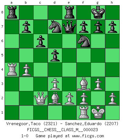 Last move : 1-0 2009 January 18 7:15:51 [Event "FICGS__CHESS__CLASS_M__000023"] [Site "FICGS"] [Date "2008.09.09"] [Round "1"] [White "Vrenegoor,Taco"] [Black "Sanchez,Eduardo"] [Result "1-0"] [WhiteElo "2321"] [BlackElo "2207"] 1.Nf3 d5 2.c4 c6 3.g3 Bg4 4.Bg2 e6 5.cxd5 exd5 6.O-O Nd7 7.d3 Ngf6 8.Nc3 Bc5 9.Qb3 Bb6 10.Na4 O-O 11.Nxb6 axb6 12.Qc2 Qe7 13.Bd2 Rfe8 14.b4 Bxf3 15.Bxf3 b5 16.a4 bxa4 17.Rxa4 1-0 This chess game has been lost on time (started : 2008.09.09 0:14:3) Reti Opening Kingside Castling by player White (move 6) Kingside Castling by player Black (move 10) Player White won this chess game. Follow this game move after move (download)It is not a move, even the best move that you must seek, but a realizable plan. (Eugene Znosko-Borovsky) Im Schach gibt es keinen Platz für Galanterie. (Irving Chernev) Una buena ofensiva y una buena defensa, comienzan ambas con un buen desarrollo. (Bruce A. Moon) Aucun coup ne doit être joué sans but. (Pedro Damiano) When you stop learning you start dying. (M. Scott Adams)