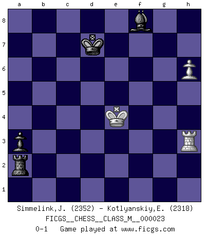 Last move : 0-1 2008 October 5 23:12:19 [Event "FICGS__CHESS__CLASS_M__000023"] [Site "FICGS"] [Date "2008.09.09"] [Round "1"] [White "Simmelink,Joop"] [Black "Kotlyanskiy,Edward"] [Result "0-1"] [WhiteElo "2352"] [BlackElo "2318"] 1.e4 c5 2.Nf3 d6 3.d4 cxd4 4.Nxd4 Nf6 5.Nc3 a6 6.Bg5 e6 7.f4 Qb6 8.Qd2 Qxb2 9.Rb1 Qa3 10.e5 h6 11.Bh4 dxe5 12.fxe5 g5 13.exf6 gxh4 14.Be2 Qa5 15.O-O h3 16.gxh3 Qg5+ 17.Qxg5 hxg5 18.Kg2 Nd7 19.Ne4 b5 20.Bf3 Bb7 21.Nxg5 Bxf3+ 22.Rxf3 Rh5 23.Ne4 Rc8 24.Re1 Rd5 25.c3 Rc4 26.h4 Nc5 27.Nxc5 Rdxc5 28.R1e3 Rh5 29.Nxe6 fxe6 30.Rxe6+ Kd7 31.Rxa6 Rcxh4 32.Ra7+ Kc6 33.h3 Ra4 34.Rxa4 bxa4 35.Rf4 a3 36.c4 Re5 37.Kf2 Re8 38.f7 Rb8 39.Rf6+ Kd7 40.Kg3 Rb2 41.Rf2 Ke6 42.h4 Bd6+ 43.Kf3 Kxf7 44.Ke3 Ke6 45.Re2 Rb1 46.Kd4 Kd7 47.c5 Bf8 48.Re3 Rc1 49.Rh3 Bxc5+ 50.Kd5 Bf8 51.h5 Rc5+ 52.Ke4 Rc2 53.h6 Rxa2 0-1 Sicilian : Najdorf, 7...Qb6 Kingside Castling by player White (move 15) 10 pieces endgame at move 34 : White KRPPPP , Black KRBP WHITE : King + 1 Rook 4 Pawns BLACK : King + 1 Rook 1 Bishop 1 Pawn 9 pieces endgame at move 43 : White KRPPP , Black KRBP WHITE : King + 1 Rook 3 Pawns BLACK : King + 1 Rook 1 Bishop 1 Pawn 8 pieces endgame at move 49 : White KRPP , Black KRBP WHITE : King + 1 Rook 2 Pawns BLACK : King + 1 Rook 1 Bishop 1 Pawn 7 pieces endgame at move 53 : White KRP , Black KRBP WHITE : King + 1 Rook 1 Pawn BLACK : King + 1 Rook 1 Bishop 1 Pawn Player Black won this chess game. Follow this game move after move (download)Bobby is the finest Chess player this country ever produced. His memory for the moves, his brilliance in dreaming up combinations, and his fierce determination to win are uncanny. (John Collins) Schon mancher Spieler hat aufgegeben, um zu vermeiden, daß er eine Figur verliert. (Savielly Grigorievitsch Tartakower) Yo jugué Ajedrez con el y a veces le pude haber ganado solo que siempre devuelve su última jugada y juega la partida de manera diferente. (Mark Twain) Les erreurs sont comme les malheurs, elles n'arrivent jamais seules. (Siegbert Tarrasch) If we knew what we were doing, we would not call it research. (Albert Einstein)