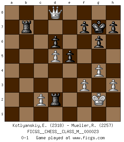 Last move : 0-1 2008 December 2 5:35:34 [Event "FICGS__CHESS__CLASS_M__000023"] [Site "FICGS"] [Date "2008.09.09"] [Round "1"] [White "Kotlyanskiy,Edward"] [Black "Mueller,Robert"] [Result "0-1"] [WhiteElo "2318"] [BlackElo "2257"] 1.e4 c5 2.Nf3 d6 3.d4 cxd4 4.Nxd4 Nf6 5.Nc3 a6 6.Be3 e5 7.Nb3 Be6 8.Qf3 Be7 9.Be2 O-O 10.Qg3 Nbd7 11.O-O Rc8 12.Bh6 Ne8 13.Be3 b5 14.a3 Bh4 15.Qf3 Nb6 16.Rfd1 Qc7 17.Nd2 Qb7 18.Nf1 Bd8 19.Bc1 Be7 20.Ne3 Nf6 21.Bd2 g6 22.h3 Rc7 23.Bd3 Rfc8 24.Be2 Nfd7 25.a4 bxa4 26.Nxa4 Nxa4 27.Rxa4 Qxb2 28.Bc1 Qb6 29.Rxa6 Qb7 30.Ba3 Nc5 31.Bxc5 Rxc5 32.Rda1 Bg5 33.Bd3 Qc7 34.Nd5 Bxd5 35.exd5 Qe7 36.g4 Bd2 37.R1a4 Rb8 38.Kg2 Kg7 39.Qe2 Bc3 40.Qe4 Rb7 41.Rc6 Rc7 42.Rca6 Bd4 43.Ra8 Rc3 44.Rb8 Ba7 45.Rb1 Qh4 46.Qe2 Bc5 47.Rb8 Re7 48.f3 Bd4 49.Rb1 Qg5 50.Rd1 Rb7 51.Qd2 Qh4 52.Qe1 Rxd3 53.Qxh4 Rxd1 54.Rxd4 Rxd4 55.Qd8 Rd2+ 0-1 Sicilian : Najdorf, Byrne (English) attack Kingside Castling by player Black (move 9) Kingside Castling by player White (move 11) Player Black won this chess game. Follow this game move after move (download)Those who say they understand Chess, understand nothing. (Robert Hubner) Schach ist ein Kampf gegen den Fehler. (Johannes Herrman Zukertort) Es muy difícil jugar en contra de la teoría de Einstein. - en su primera derrota en contra de Fischer (Mikhail Tal) Avant la finale, les dieux ont créé le milieu de partie. (Tarrasch) The worth of a book is to be measured by what you can carry away from it. (James Bryce)