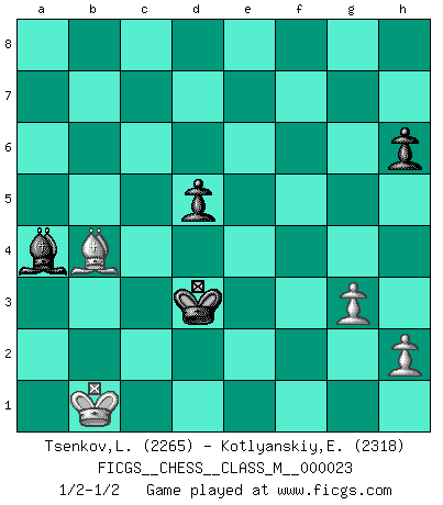 Last move : 1/2-1/2 2008 October 14 17:29:13 [Event "FICGS__CHESS__CLASS_M__000023"] [Site "FICGS"] [Date "2008.09.09"] [Round "1"] [White "Tsenkov,Ljubomir"] [Black "Kotlyanskiy,Edward"] [Result "1/2-1/2"] [WhiteElo "2265"] [BlackElo "2318"] 1.c4 e5 2.Nc3 Nf6 3.Nf3 Nc6 4.g3 Bb4 5.Bg2 O-O 6.O-O e4 7.Ng5 Bxc3 8.bxc3 Re8 9.f3 exf3 10.Nxf3 Qe7 11.e3 Ne5 12.d3 Rb8 13.Rb1 Nxf3+ 14.Qxf3 d6 15.e4 Nd7 16.d4 b6 17.Re1 Ba6 18.Bf1 Qe6 19.Bf4 h6 20.Qf2 g5 21.Bd2 Qg6 22.Qf3 Nf6 23.Bd3 Bb7 24.d5 Re5 25.c5 Rbe8 26.cxd6 cxd6 27.c4 Nxe4 28.Bc3 R5e7 29.Re3 f5 30.Rbe1 g4 31.Qf4 Ba6 32.a4 Ng5 33.Rxe7 Rxe7 34.Kg2 Rxe1 35.Bxe1 Qf6 36.Qxf5 Qxf5 37.Bxf5 Bxc4 38.Bxg4 Bxd5+ 39.Kf2 a5 40.Ke3 Bb3 41.Kd3 Bxa4 42.Bf2 Nf7 43.Kc3 b5 44.Bb6 b4+ 45.Kb2 Ne5 46.Be6+ Kg7 47.Bxa5 Kf6 48.Bd5 Nd3+ 49.Kb1 Ke5 50.Bc4 Kd4 51.Bxd3 Kxd3 52.Bxb4 d5 1/2-1/2 English Opening Kingside Castling by player Black (move 5) Kingside Castling by player White (move 6) 10 pieces endgame at move 51 : White KBBPP , Black KBPPP WHITE : King + 2 Bishops 2 Pawns BLACK : King + 1 Bishop 3 Pawns 9 pieces endgame at move 51 : White KBPP , Black KBPPP WHITE : King + 1 Bishop 2 Pawns BLACK : King + 1 Bishop 3 Pawns 8 pieces endgame at move 52 : White KBPP , Black KBPP WHITE : King + 1 Bishop 2 Pawns BLACK : King + 1 Bishop 2 Pawns This chess game ended in a draw. Follow this game move after move (download)Pawns: they are the soul of this game, they alone form the attack and defense. (Philidor) Stil? Ich habe keinen Stil! (Anatoly Karpov) El Ajedrez tiene tanto misterio como las mujeres. (Purdy) Dieu déplace le joueur, et celui-ci la pièce. Quel Dieu derrière Dieu commence donc la trame ? Arturo Perez-Reverte (prix de littérature policière 1993). First of all, we have to go back to the classical time control. (Anatoly Karpov)