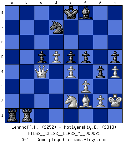Last move : 0-1 2009 June 19 22:21:32 [Event "FICGS__CHESS__CLASS_M__000023"] [Site "FICGS"] [Date "2008.09.09"] [Round "1"] [White "Lehnhoff,Heinz-Georg"] [Black "Kotlyanskiy,Edward"] [Result "0-1"] [WhiteElo "2252"] [BlackElo "2318"] 1.d4 d5 2.c4 c6 3.Nf3 Nf6 4.Nc3 e6 5.Bg5 h6 6.Bh4 dxc4 7.e4 g5 8.Bg3 b5 9.Be2 Bb7 10.h4 g4 11.Ne5 Nbd7 12.Nxd7 Qxd7 13.Be5 Qe7 14.O-O Rg8 15.b3 b4 16.Na4 c3 17.Qd3 Nd7 18.Bg3 a5 19.a3 h5 20.Rfd1 Qd8 21.Qe3 Qe7 22.Qd3 Rg6 23.Ra2 Ba6 24.Qc2 Bxe2 25.Qxe2 bxa3 26.Nxc3 Qb4 27.Qc2 e5 28.Ne2 a4 29.bxa4 Qxa4 30.Qb1 Rd6 31.Rd3 Re6 32.Qa1 f6 33.Rad2 Rd6 34.Ra2 Qb5 35.Qd1 c5 36.d5 Rda6 37.Rb3 Qa5 38.Qc1 Qa4 39.Rbxa3 Qxa3 40.Rxa3 Rxa3 41.Kh2 Ra1 42.Qc4 Rb1 43.f3 R8a1 44.Bf2 f5 0-1 QGD Slav : 4.Nc3 Kingside Castling by player White (move 14) Player Black won this chess game. Follow this game move after move (download)It began to feel as though you were playing against Chess itself. - On playing against Robert Fischer. (Walter Shipman) Ein typischer, sehr verbreiteter Gedankenschädling ist der, daß der betreffende Amateur von der Annanhme ausgeht, daß jeder einzelne Zug etwas zu leisten habe. (Aaron Nimzowitsch) Cuando me preguntan: -¿Cual es el secreto que te hace hacer mejores movidas que tus oponentes?, Yo respondo: Me da gusto que me pregunten eso, porque, como veran, hay una simple razón. Yo pienso mis propias movidas y dejo a mi oponente que el piense las suyas. (Alexander Alekhine) La solitude du joueur d'Echecs à l'approche du mat est semblable à celle du condamné. (Francis Szpiner) Opportunities multiply as they are seized. (Sun Tzu)