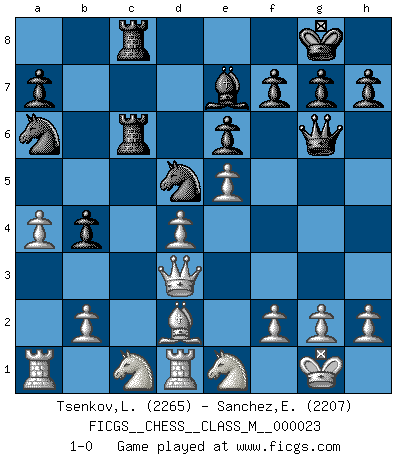 Last move : 1-0 2009 January 21 19:28:26 [Event "FICGS__CHESS__CLASS_M__000023"] [Site "FICGS"] [Date "2008.09.09"] [Round "1"] [White "Tsenkov,Ljubomir"] [Black "Sanchez,Eduardo"] [Result "1-0"] [WhiteElo "2265"] [BlackElo "2207"] 1.c4 c6 2.Nc3 d5 3.d4 dxc4 4.e4 b5 5.a4 b4 6.Na2 Nf6 7.e5 Nd5 8.Bxc4 e6 9.Nf3 Be7 10.O-O O-O 11.Qc2 Ba6 12.Bxa6 Nxa6 13.Qxc6 Qa5 14.Qc2 Rfc8 15.Qb3 Qc7 16.Bd2 Qc2 17.Nc1 Rab8 18.Rd1 Rc6 19.Ne1 Qg6 20.Qf3 Rbc8 21.Qd3 1-0 This chess game has been lost on time (started : 2008.09.09 0:14:3) English : Caro-Kann defensive system Kingside Castling by player White (move 10) Kingside Castling by player Black (move 10) Player White won this chess game. Follow this game move after move (download)The sign of a great Master is his ability to win a won game quickly and painlessly. (Irving Chernev) Im Wettkampf zwischen starken Meistern kommen Fehler sehr selten vor, deshalb ist es mit bloßem Warten nicht getan. (José Raúl Capablanca) Tu sabes que vas a perder. Aún cuando tenía la ventaja, yo sabía que iba a perder. - al estar jugando con Fischer (Andrew Soltis) Toute estimation doit être constamment réévaluée. (Jacob Estrin) Every vice is only an exaggeration of a necessary and virtuous function. (Ralph Waldo Emerson, Journals 1936)