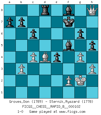 Last move : 1-0 2008 September 24 9:50:19 [Event "FICGS__CHESS__RAPID_B__000102"] [Site "FICGS"] [Date "2008.09.09"] [Round "1"] [White "Groves,Don"] [Black "Sternik,Ryszard"] [Result "1-0"] [WhiteElo "1789"] [BlackElo "1778"] 1.Nf3 d5 2.g3 Nf6 3.Bg2 c6 4.O-O Nbd7 5.d4 e6 6.Nbd2 Bd6 7.c4 O-O 8.Qc2 Re8 9.Rd1 Qe7 10.e4 dxe4 11.Nxe4 Nxe4 12.Qxe4 e5 13.Re1 exd4 14.Qxd4 Ne5 15.Bf4 Nxf3+ 16.Bxf3 Qxe1+ 17.Rxe1 Rxe1+ 18.Kg2 Be7 19.Qd2 Ra1 20.Qe2 Bf8 21.b3 f6 22.Be4 g6 23.Be3 f5 24.Bd4 Rxa2 25.Qxa2 fxe4 26.Qa5 h5 27.h3 Bf5 28.Qe5 Rd8 29.Qh8+ Kf7 30.g4 1-0 Reti : King's Indian attack (Barcza system) Kingside Castling by player White (move 4) Kingside Castling by player Black (move 7) Player White won this chess game. Follow this game move after move (download)Dazzling combinations are for the many, shifting wood is for the few. (Georg Kieninger) Wer wird heute Abend ihr Gegner sein? -- Heute Abend spiele ich gegen die schwarzen Steine. (Akiba Rubinstein) Yo jugué Ajedrez con el y a veces le pude haber ganado solo que siempre devuelve su última jugada y juega la partida de manera diferente. (Mark Twain) Des combinaisons [dans le jeu d'échecs] pareilles à des mélodies. Je crois entendre pour ainsi dire la musique des coups... (Vladimir Nabokov) Luck is the residue of design. (John Milton)