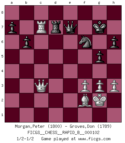 Last move : 1/2-1/2 2008 October 7 20:36:58 [Event "FICGS__CHESS__RAPID_B__000102"] [Site "FICGS"] [Date "2008.09.09"] [Round "1"] [White "Morgan,Peter"] [Black "Groves,Don"] [Result "1/2-1/2"] [WhiteElo "1800"] [BlackElo "1789"] 1.c4 e5 2.Nc3 Nf6 3.g3 Bb4 4.Bg2 O-O 5.Nf3 Nc6 6.O-O e4 7.Ng5 Bxc3 8.bxc3 Re8 9.Qc2 Qe7 10.d3 exd3 11.exd3 b6 12.Bd2 Bb7 13.Rae1 Qf8 14.Bf4 d6 15.Qa4 Na5 16.Be3 Bxg2 17.Kxg2 h6 18.Nf3 c5 19.Bf4 Re6 20.Rxe6 fxe6 21.Nd2 e5 22.Be3 Qf7 23.f3 d5 24.Bxc5 dxc4 25.dxc4 Rc8 26.Bf2 Nxc4 27.Qa6 Rc7 28.Nxc4 Rxc4 29.Qb5 Rxc3 30.Qxe5 Ra3 31.Rc1 Rxa2 32.Rc8+ Kh7 33.Qf5+ g6 34.Qf4 g5 35.Qf5+ Kg7 36.Rc6 Qe7 37.h3 Ra5 38.Qc2 Rd5 39.Qc3 Rd6 40.Rc7 Rd7 1/2-1/2 English : Bremen, Smyslov system Kingside Castling by player Black (move 4) Kingside Castling by player White (move 6) This chess game ended in a draw. Follow this game move after move (download)Chess is so inspiring that I do not believe a good player is capable of having an evil thought during the game. (Wilhelm Steinitz) Kombinieren und Schwarzhandel gehören verboten. (Savielly Grigorievitsch Tartakower) EL Ajedrez es como la vida. (Boris Spassky) Karpov est une pièce de musée. (Garry Kasparov) Luck never made a man wise. (Seneca, Letters to Lucilius)