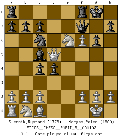 Last move : 0-1 2008 September 15 20:42:51 [Event "FICGS__CHESS__RAPID_B__000102"] [Site "FICGS"] [Date "2008.09.09"] [Round "1"] [White "Sternik,Ryszard"] [Black "Morgan,Peter"] [Result "0-1"] [WhiteElo "1778"] [BlackElo "1800"] 1.e4 e5 2.Nf3 Nc6 3.d4 exd4 4.Bc4 Nf6 5.O-O Bc5 6.e5 d5 7.exf6 dxc4 8.Re1+ Be6 9.Ng5 g6 10.Qf3 O-O 11.Rxe6 fxe6 12.Nxe6 Qe8 13.Qd5 Qf7 0-1 Scotch gambit : Dubois-Reti defense Kingside Castling by player White (move 5) Kingside Castling by player Black (move 10) Player Black won this chess game. Follow this game move after move (download)White lost because he failed to remember the right continuation and had to think up the moves himself. (Siegbert Tarrasch) Spiel ein langweiliges Spiel zu Ende und lustige Dinge können passieren. (Hans Ree) Buenas posiciones no logran ganar juegos, buenas movidas sí. (Gerald Abrahams) Même si vous avez un bon coup à faire, regardez toujours s'il n'y en a pas un qui lui soit préférable. (Pedro Damiano) A good teacher is like a candle - it consumes itself to light the way for others. (Author unknown)