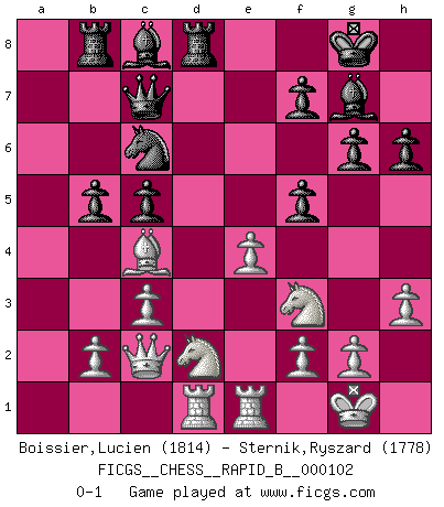 Last move : 0-1 2008 November 5 19:51:14 [Event "FICGS__CHESS__RAPID_B__000102"] [Site "FICGS"] [Date "2008.09.09"] [Round "1"] [White "Boissier,Lucien"] [Black "Sternik,Ryszard"] [Result "0-1"] [WhiteElo "1814"] [BlackElo "1778"] 1.d4 Nf6 2.Nf3 g6 3.Bg5 Bg7 4.Nbd2 O-O 5.c3 d6 6.e4 c5 7.dxc5 dxc5 8.Bc4 Nc6 9.O-O Qc7 10.Qe2 h6 11.Bxf6 exf6 12.Rad1 Re8 13.Rfe1 Rb8 14.Qd3 a6 15.a4 f5 16.h3 Rd8 17.Qc2 b5 18.axb5 axb5 0-1 This chess game has been lost on time (started : 2008.09.09 12:6:21) King's Indian : Torre attack Kingside Castling by player Black (move 4) Kingside Castling by player White (move 9) Player Black won this chess game. Follow this game move after move (download)In complicated positions, Bobby Fischer hardly had to be afraid of anybody. (Paul Keres) Schach ist das Spiel, das die Verrückten gesund hält. (Albert Einstein) Mi estilo es algo parecido entre un poco de Tal y Petrosian. (Reshevsky) Demandez au pauvre Cg1 ce qu'il en pense. Eduard Gufeld à propos de la variante Saemisch de l'Est-Indienne. I don't believe in psychology. I believe in good moves. (Bobby Fischer)