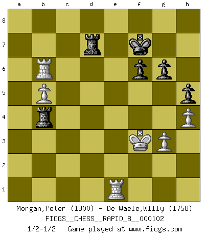 Last move : 1/2-1/2 2008 October 22 17:54:44 [Event "FICGS__CHESS__RAPID_B__000102"] [Site "FICGS"] [Date "2008.09.09"] [Round "1"] [White "Morgan,Peter"] [Black "De Waele,Willy"] [Result "1/2-1/2"] [WhiteElo "1800"] [BlackElo "1758"] 1.c4 e5 2.Nc3 Nf6 3.g3 d5 4.cxd5 Nxd5 5.Bg2 Nb6 6.Nf3 Nc6 7.O-O Be7 8.a4 a5 9.d3 Be6 10.Be3 O-O 11.d4 exd4 12.Nxd4 Nxd4 13.Bxd4 c5 14.Be3 Nc4 15.Bf4 Bd6 16.Bxd6 Qxd6 17.b3 Qe5 18.Ne4 Bf5 19.Qd3 Nd2 20.Qxd2 Bxe4 21.Qe3 Rfe8 22.Bxe4 Qxe4 23.Qxc5 Qxe2 24.Rac1 Qd3 25.Qb6 g6 26.Rc5 Qd4 27.Rb5 Qxb6 28.Rxb6 Rad8 29.Rxb7 Re2 30.Rb5 Rd3 31.Kg2 h5 32.h4 Kg7 33.Rh1 Ra2 34.Re1 R3d2 35.Kf3 Rxf2+ 36.Ke4 Rad2 37.Rxa5 Rd7 38.Rb5 Re7+ 39.Re5 Rd7 40.b4 f6 41.Re6 Kf7 42.Ke3 Ra2 43.Kf3 Rxa4 44.b5 Rb4 45.Rb6 1/2-1/2 English : Bremen, reverse Dragon Kingside Castling by player White (move 7) Kingside Castling by player Black (move 10) This chess game ended in a draw. Follow this game move after move (download)At this time Fischer is simply a level above all the best Chessplayers in the world. (John Jacobs) Jeder Schachmeister war einmal ein Anfänger. (Irving Chernev) Una de estas pequeñas movidas modestas pudieran ser mas molestas a tu oponente que la amenaza mas grande. (Siegbert Tarrasch) Le système Elo représente seulement une moyenne. Il est simplement un indicateur de votre stabilité. (Anatoli Karpov) The general who wins the battle makes many calculations in his temple before the battle is fought. The general who loses makes but few calculations beforehand. (Sun Tzu)