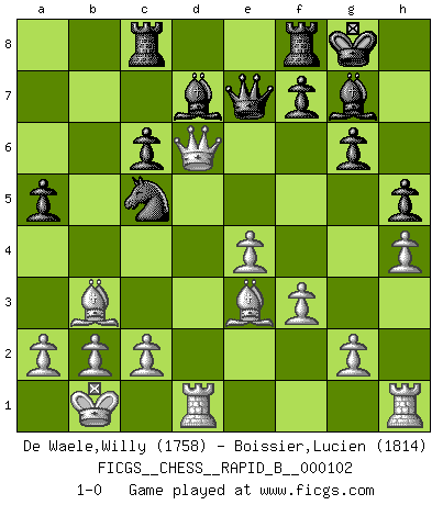 Last move : 1-0 2008 November 6 13:54:55 [Event "FICGS__CHESS__RAPID_B__000102"] [Site "FICGS"] [Date "2008.09.09"] [Round "1"] [White "De Waele,Willy"] [Black "Boissier,Lucien"] [Result "1-0"] [WhiteElo "1758"] [BlackElo "1814"] 1.e4 c5 2.Nf3 Nc6 3.d4 cxd4 4.Nxd4 g6 5.Nc3 Bg7 6.Be3 Nf6 7.Bc4 O-O 8.Bb3 d6 9.f3 Nd7 10.h4 h5 11.Qd2 Nc5 12.Nd5 Bd7 13.O-O-O Rc8 14.Kb1 a5 15.Nxc6 bxc6 16.Nxe7+ Qxe7 17.Qxd6 1-0 This chess game has been lost on time (started : 2008.09.09 12:6:21) Sicilian : Accelerated Fianchetto, Modern variation with Bc4 Kingside Castling by player Black (move 7) Queenside Castling by player White (move 13) Player White won this chess game. Follow this game move after move (download)A great player and a great example for many. His book My 60 Memorable Games had a big impact on me. It is a shame he didn't continue to enrich the world of chess with his unparalleled understanding after 1972. (Jan Timman, about Bobby Fischer's death) Es tut gut, die Entwicklungsperiode von, [...] demokratischem Geist durchdringen zu lassen. Wie undemokratisch wäre es doch beispielsweise, den einen Offizier große Spaziertouren vornehmen zu lassen, während die anderen zu Hause säßen und sich entsetzlich langweilten. (Aaron Nimzowitsch) Yo no creo en la psicología. Yo creo en las buenas movidas. (Bobby Fischer) Les échecs, c'est l'art d'analyser. (Mikhail Botvinnik) See no evil, hear no evil, speak no evil. (The 3 monkeys)