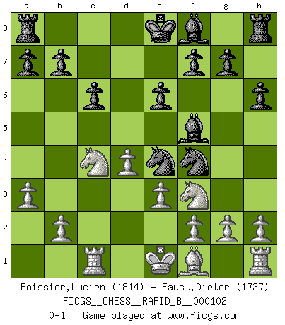 Last move : 0-1 2008 November 28 22:27:12 [Event "FICGS__CHESS__RAPID_B__000102"] [Site "FICGS"] [Date "2008.09.09"] [Round "1"] [White "Boissier,Lucien"] [Black "Faust,Dieter"] [Result "0-1"] [WhiteElo "1814"] [BlackElo "1727"] 1.d4 d5 2.Nf3 c6 3.c3 Nf6 4.Bg5 h6 5.Bf4 Bf5 6.a3 Nbd7 7.e3 Ne4 8.c4 e6 9.Qb3 Qb6 10.Qxb6 Nxb6 11.Nbd2 dxc4 12.Nxc4 Nd5 13.Rc1 Nxf4 0-1 This chess game has been lost on time (started : 2008.09.09 12:6:21) Queen's pawn game Player Black won this chess game. Follow this game move after move (download)There is no remorse like the remorse of Chess. (H. G. Wells) Wir können eben der zündenden Macht des Opfers nicht wiederstehen, denn die Begeisterung für das Opfer liegt in der Natur des Menschen. (Rudolf Spielmann) Me gusta decir que Bobby Fischer fue el mejor jugador que jamás haya existido. Pero lo que hizo de Fischer un genio, fue su habilidad de mezclar una frescura y pragmatismo Americano con ideas Rusas acerca de la estrategia. (Bruce Pandolfini) À la honte des hommes, on sait que les lois du jeu sont les seules qui soient partout justes, claires, inviolables et exécutées. Pourquoi l'Indien qui a donné les règles du jeu d'échecs est-il obéi de bon gré dans toute la terre, et que les décrétales des papes, par exemple, sont aujourd'hui un objet d'horreur et de mépris ? C'est que l'inventeur des échecs combina tout avec justesse pour la satisfaction des joueurs, et que les papes, dans leurs décrétales, n'eurent en vue que leur seul avantage. L'Indien voulut exercer également l'esprit des hommes et leur donner du plaisir; les papes ont voulu abrutir l'esprit des hommes. Voltaire (Dictionnaire philosophique / Garnier 1967) Warrior pose battles inner weakness and wins focus. You see that there is no war within you. You're on your own side, and you are your own strength. (Terri Guillemets)