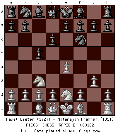 Last move : 1-0 2008 September 14 23:28:0 [Event "FICGS__CHESS__RAPID_B__000102"] [Site "FICGS"] [Date "2008.09.09"] [Round "1"] [White "Faust,Dieter"] [Black "Natarajan,Premraj"] [Result "1-0"] [WhiteElo "1727"] [BlackElo "1811"] 1.e4 c5 2.Nc3 d6 3.Nge2 Nf6 4.g3 1-0 Sicilian : Closed Player White won this chess game. Follow this game move after move (download)The way he plays Chess demonstrates a man's whole nature. (Stanley Ellin) Ich verachte die Medien. (Robert James Fischer) Estaba muy claro de que el punto vulnerable del Gran Maestro Americano (Bobby Fischer) radicaba en las posiciones de doble filo, colgantes, irracionales, donde el siempre falló en encontrar un triunfo aún en una posición de clara victoria. (Efim Geller) Vous savez, camarade Pachman, je n'éprouve pas de plaisir à être ministre, je jouerais plutôt aux échecs comme vous, ou alors ferais une révolution au Venezuela. (Che Guevara à Ludek Pachman, 'Checkmate in Prague', 1975) That's absurd. I love it. (Gregory House, House M.D.)