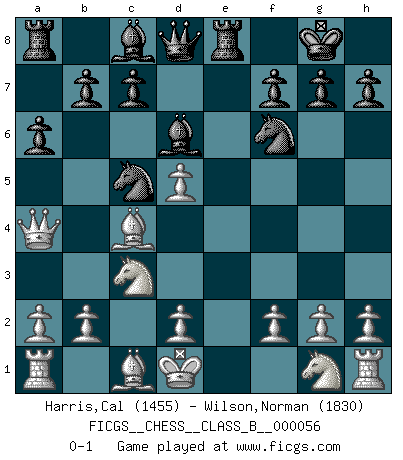 Last move : 0-1 2008 October 21 22:11:2 [Event "FICGS__CHESS__CLASS_B__000056"] [Site "FICGS"] [Date "2008.09.10"] [Round "1"] [White "Harris,Cal"] [Black "Wilson,Norman"] [Result "0-1"] [WhiteElo "1455"] [BlackElo "1830"] 1.e4 e6 2.c4 d5 3.cxd5 exd5 4.exd5 Nf6 5.Qa4+ Nbd7 6.Bc4 Bd6 7.Bb5 O-O 8.Nc3 Re8+ 9.Kd1 a6 10.Bc4 Nc5 0-1 French defense, Steiner variation Kingside Castling by player Black (move 7) Player Black won this chess game. Follow this game move after move (download)If Chess is a science, it's a most inexact one. If Chess is an art, it is too exacting to be seen as one. If Chess is a sport, it's too esoteric. If Chess is a game, it's too demanding to be just a game. If Chess is a mistress, she's a demanding one. If Chess is a passion, it's a rewarding one. If Chess is life, it's a sad one. (Unknown) Weshalb minderdergeübte Spieler mit g2-g4 beginnen? Die betreffenden sind unschlüssig, ob sie nun rechts (h4) oder links (f4) beginnen sollen, und in ihrer Ratlosigkeit entschliessen sie sich nach guter Bürgerart dazu, den goldenen Mittelweg zu wählen. (Aaron Nimzowitsch) Tu cuerpo tiene que estar en óptima condición. Tu Ajedrez se deteriora como lo hace tu cuerpo. No puedes separar la mente y el cuerpo. (Bobby Fischer) Roi des jeux et jeu des rois, les échecs portent en eux un sentiment d'infini. Ils donnent à celui qui s'est efforcé d'en approfondir les arcanes l'impression de n'être pas à la mesure de l'homme; en fait, ils constituent un résumé de l'univers, un microcosme, et figurent cette grande échelle qui, dans les plans de la lumière descend jusqu'à la matière, qui des abîmes insondables remonte jusqu'en l'infini de Dieu. (Pyrame) Some people are so afraid to die that they never begin to live. (Henry Van Dyke)