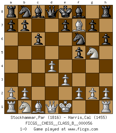 Last move : 1-0 2008 November 10 20:41:40 [Event "FICGS__CHESS__CLASS_B__000056"] [Site "FICGS"] [Date "2008.09.10"] [Round "1"] [White "Stockhammar,Par"] [Black "Harris,Cal"] [Result "1-0"] [WhiteElo "1816"] [BlackElo "1455"] 1.d4 d5 2.Nf3 f5 3.c4 dxc4 4.e3 c6 5.Bxc4 Nf6 6.Ng5 h6 7.Bf7+ 1-0 This chess game has been lost on time (started : 2008.09.10 17:28:11) Queen's pawn game Player White won this chess game. Follow this game move after move (download)The blunders are all there on the board, waiting to be made. (Savielly Tartakover) Kleine Schachspieler machen Mist, und große Schachspieler machen Mist, aber große machen weniger Mist. (Fritz Sämisch) Sin errores no puede haber brillantez. (Emanuel Lasker) Vous n'êtes pas toujours obligé de jouer le meilleur coup. Un coup doit être actif, entreprenant, correct et beau ! (David Bronstein) If you lose the game you should win the analysis! (Proverb)