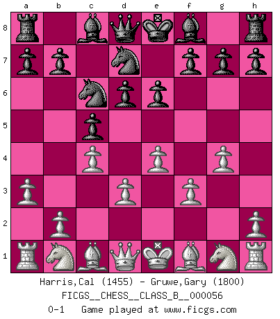 Last move : 0-1 2008 December 12 2:17:22 [Event "FICGS__CHESS__CLASS_B__000056"] [Site "FICGS"] [Date "2008.09.10"] [Round "1"] [White "Harris,Cal"] [Black "Gruwe,Gary"] [Result "0-1"] [WhiteElo "1455"] [BlackElo "1800"] 1.e4 c5 2.c4 Nc6 3.g4 d6 4.a3 Nf6 5.f3 e6 6.d3 Nd7 0-1 This chess game has been lost on time (started : 2008.09.10 17:28:11) Sicilian defense Player Black won this chess game. Follow this game move after move (download)When the Chess game is over, the Pawn and the King go back to the same box. (Irish saying) Vielleicht wirkt die Aura früherer Spieler glanzvoller als die der heutigen Spieler, aber das liegt daran, dass man kein Programm wie Fritz hatte, das einem all die Löcher in ihren Partien zeigt. (Vladimir Kramnik) Uno por uno, yo los acribillé, mi superioridad muy pronto se volvio aparente. (Jose Capablanca) Les erreurs sont comme les malheurs, elles n'arrivent jamais seules. (Siegbert Tarrasch) But they are useless. They can only give you answers. (Pablo Picasso, about computers)