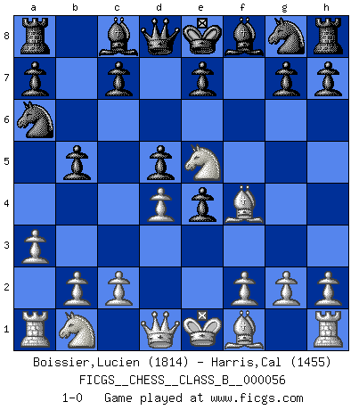Last move : 1-0 2008 November 27 10:1:22 [Event "FICGS__CHESS__CLASS_B__000056"] [Site "FICGS"] [Date "2008.09.10"] [Round "1"] [White "Boissier,Lucien"] [Black "Harris,Cal"] [Result "1-0"] [WhiteElo "1814"] [BlackElo "1455"] 1.d4 d5 2.a3 f5 3.Nf3 b5 4.Bf4 Na6 5.e4 fxe4 6.Ne5 1-0 This chess game has been lost on time (started : 2008.09.10 17:28:11) Queen's pawn game Player White won this chess game. Follow this game move after move (download)Whoever sees no other aim in the game than that of giving checkmate to one's opponent will never become a good Chess player. (Euwe) Wenn ich Weiß habe gewinne ich weil ich Weiß habe, wenn ich Schwarz habe gewinne ich weil ich Bogoljubov bin. (Efim Bogoljubov) El Ajedrez es de 30 a 40 por ciento psicología. Uno no cuenta con esto cuando se juega contra una computadora. No lo puedo confundir. (Judith Polgar) Que feriez-vous si vous étiez en train de jouer aux échecs et que la fin du monde arrive ? Je continuerais à jouer. (Saint Borromée) 98% of all statistics are made up. (Author unknown)