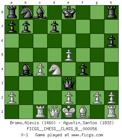 Last move : 0-1 2008 September 28 19:36:32 [Event "FICGS__CHESS__CLASS_B__000056"] [Site "FICGS"] [Date "2008.09.10"] [Round "1"] [White "Bromo,Alexis"] [Black "Agustin,Santos"] [Result "0-1"] [WhiteElo "1460"] [BlackElo "1832"] 1.d4 f5 2.c4 Nf6 3.Bg5 Ne4 4.f4 c5 5.Nf3 cxd4 6.Nxd4 h6 7.Bh4 g5 8.Bg3 e5 9.fxe5 Qa5+ 10.Nc3 Nxc3 11.bxc3 Qxc3+ 12.Kf2 f4 13.Bxf4 gxf4 14.Rc1 Qe3+ 15.Ke1 Bb4+ 0-1 Dutch defense Player Black won this chess game. Follow this game move after move (download)We must make sure that Chess will not be like a dead language, very interesting, but for a very small group. (Sytze Faber) Im Wettkampf zwischen starken Meistern kommen Fehler sehr selten vor, deshalb ist es mit bloßem Warten nicht getan. (José Raúl Capablanca) Tu sabes, camarada Pachman, no disfruto el ser un Ministro, preferería jugar al Ajedrez como tu. (Che Guevara) Demandez au pauvre Cg1 ce qu'il en pense. Eduard Gufeld à propos de la variante Saemisch de l'Est-Indienne. Chess, like love, like music, has the power to make people happy. (Siegbert Tarrasch)