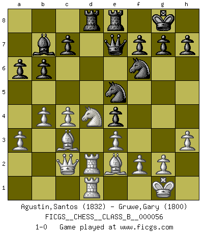 Last move : 1-0 2008 December 21 3:18:20 [Event "FICGS__CHESS__CLASS_B__000056"] [Site "FICGS"] [Date "2008.09.10"] [Round "1"] [White "Agustin,Santos"] [Black "Gruwe,Gary"] [Result "1-0"] [WhiteElo "1832"] [BlackElo "1800"] 1.d4 Nf6 2.Nf3 e6 3.c4 Bb4+ 4.Nc3 Nc6 5.Qc2 O-O 6.Bd2 d6 7.a3 Bxc3 8.Bxc3 Re8 9.e3 e5 10.dxe5 dxe5 11.Rd1 Qe7 12.h3 e4 13.Nd4 Ne5 14.Be2 a6 15.b4 b6 16.O-O Bb7 17.Rd2 Rad8 18.Rfd1 1-0 This chess game has been lost on time (started : 2008.09.10 17:28:11) Queen's pawn game Kingside Castling by player Black (move 5) Kingside Castling by player White (move 16) Player White won this chess game. Follow this game move after move (download)Kasparov : J'adoube , Ivanchuk : S'il vous plaît ! (Garry Kasparov & Vassily Ivanchuk, Linares 1997) Ich verstehe mehr vom Schach als irgendein anderer lebender Meister. (José Raúl Capablanca) ¿Esta Bobby Fischer algo cuerdo?. (Salo Flohr) Il vaut toujours mieux jouer un plan faux de façon logique que de n'avoir pas de plan du tout. (Victor Kortchnoï) Creativity is inventing, experimenting, growing, taking risks, breaking rules, making mistakes, and having fun. (Mary Lou Cook)